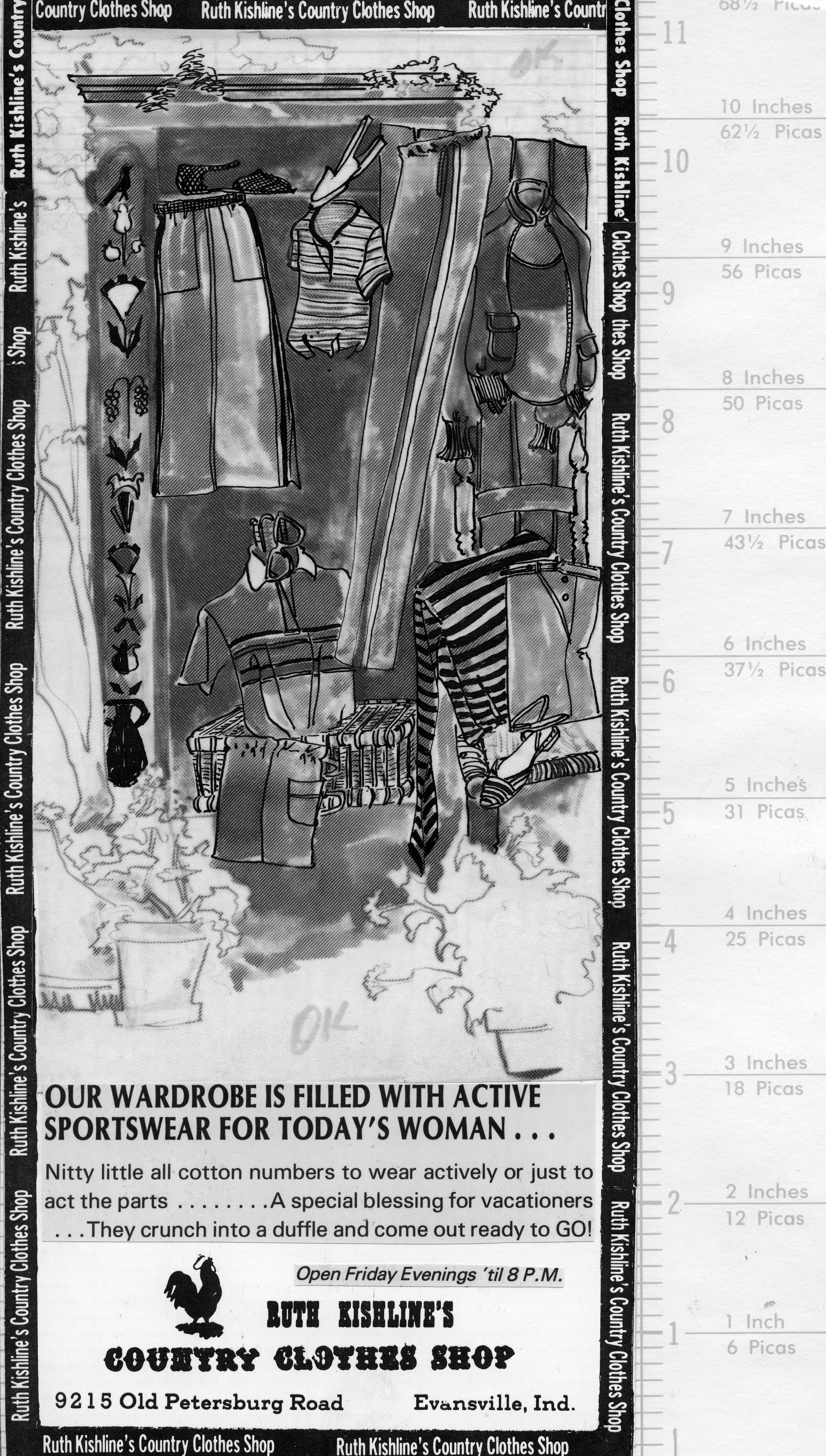 Sketch of a wardrobe displaying various sportswear--skirt, shorts, shoes, tops, pants, trousers. This is the cut out of the advertisement, and the copy reads, Our wardrobe is filled with active sportswear for today's woman...Nitty little all cotton numbers to wear actively or just to act the parts........A special blessing for vacationers...They crunch into a duffle and come out ready to GO! The text also includes the name of the store, the address, and Friday hours.