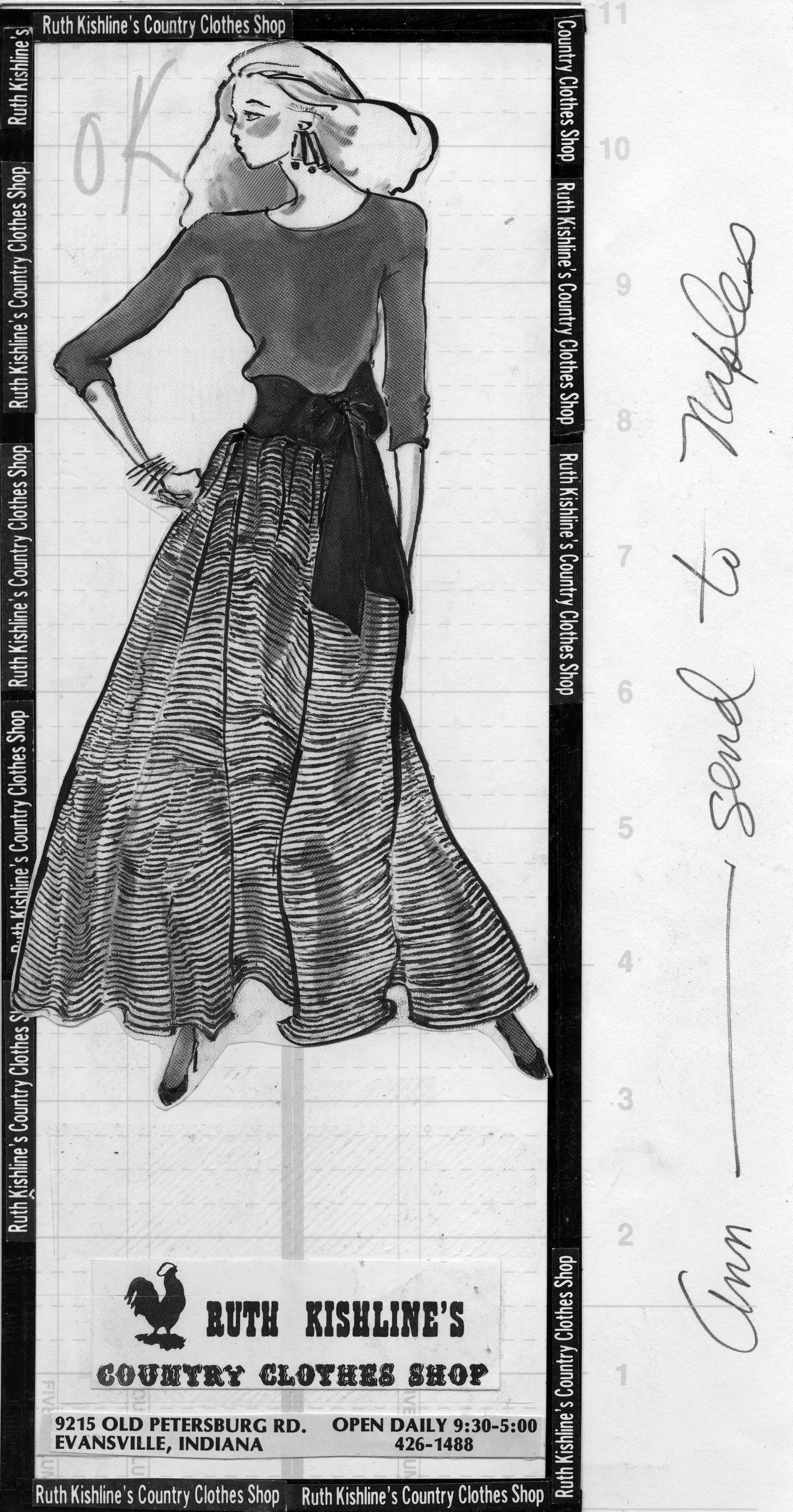 Sketch of a woman wearing a long sleeved blouse with long skirt abd wide, tied belt. This is the cut out of the advertisement, but there is no copy except for the name of the store, the address, and regular hours. Handwritten on the side are the words, Ann--send to Naples. The date of October 14, 1989 is stamped on the back.