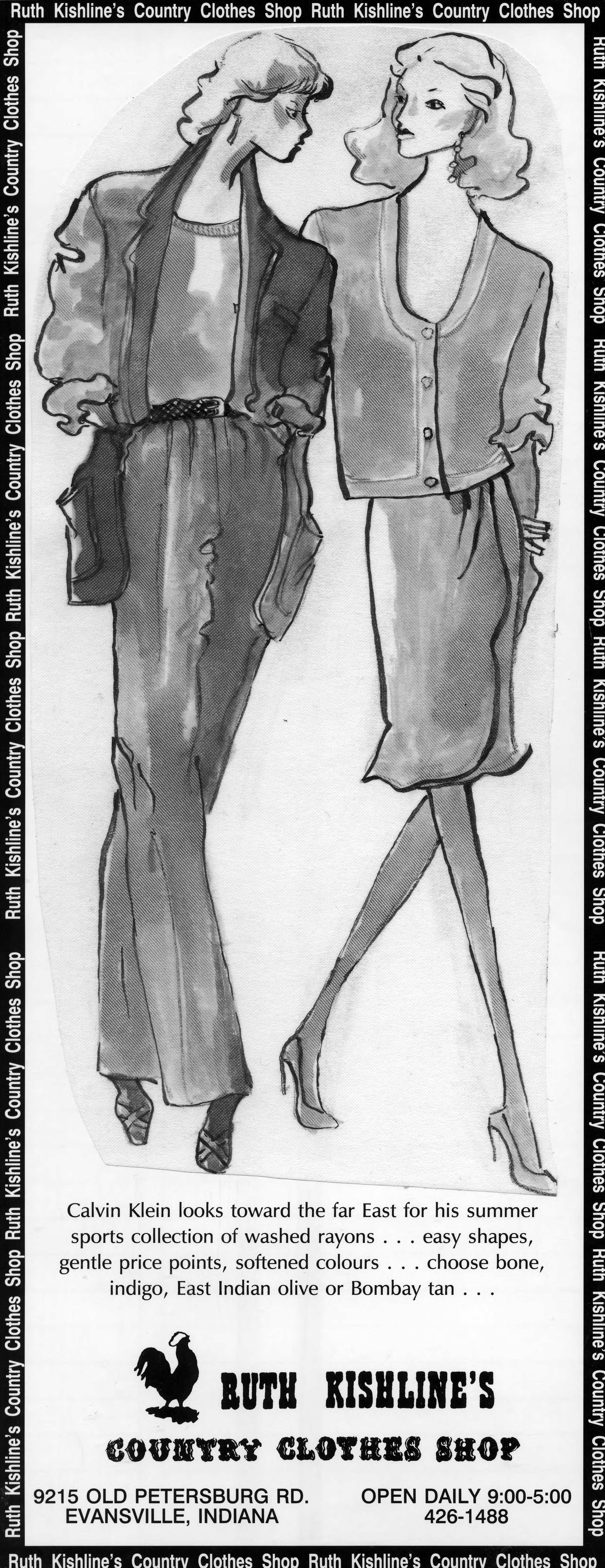 Sketch of 2 women wearing a sweaterjacket with pants and short jacket with wrapped skirt. This is the cut out of the advertisement, and the copy reads, Calvin Klein looks toward the far East for his summer sports collection of washed rayons...easy shapes, gentle price points, softened colours...choose bone, indigo, East Indian olive or Bombay tan... The text also includes the name of the store, the address, and regular hours. The date of 3-17-91 is written on the back. Calvin Klein is a global lifestyle brand that exemplifies bold, progressive ideals and a seductive, and often minimal, aesthetic. We seek to thrill and inspire our audience while using provocative imagery and striking designs to ignite the senses. After nearly 50 years, Calvin Klein continues to be a cultural catalyst across the globe by embracing tension, sparking ideas and creating unforeseen realities. We believe in a culture that provokes discovery and brave thinking. We strive to make a positive impact on the world. We inspire passion in our people. We embody authenticity and embrace individuality. Founded in 1968 by Calvin Klein and his business partner Barry Schwartz, we have built our reputation as a leader in American fashion through our clean aesthetic and innovative designs. Global retail sales of Calvin Klein products exceed $8 billion in 2015 and were distributed in [over] 110 countries. Calvin Klein employs over 10,000 associates globally. In 2003, we were acquired by PVH Corp., one of the largest apparel companies in the world. With a history going back over 130 years, PVH has excelled at growing brands and businesses with rich American heritages, becoming one of the largest global apparel companies. We have over 30,000 associates operating in over 40 countries with over $8 billion in revenues. We own the iconic Calvin Klein, Tommy Hilfiger, Van Heusen, IZOD, ARROW, Speedo*, Warner�s and Olga brands and market a variety of goods under these and other nationally and internationally known owned and licensed brands. (https://explore.calvinklein.com/en_US/corporate)