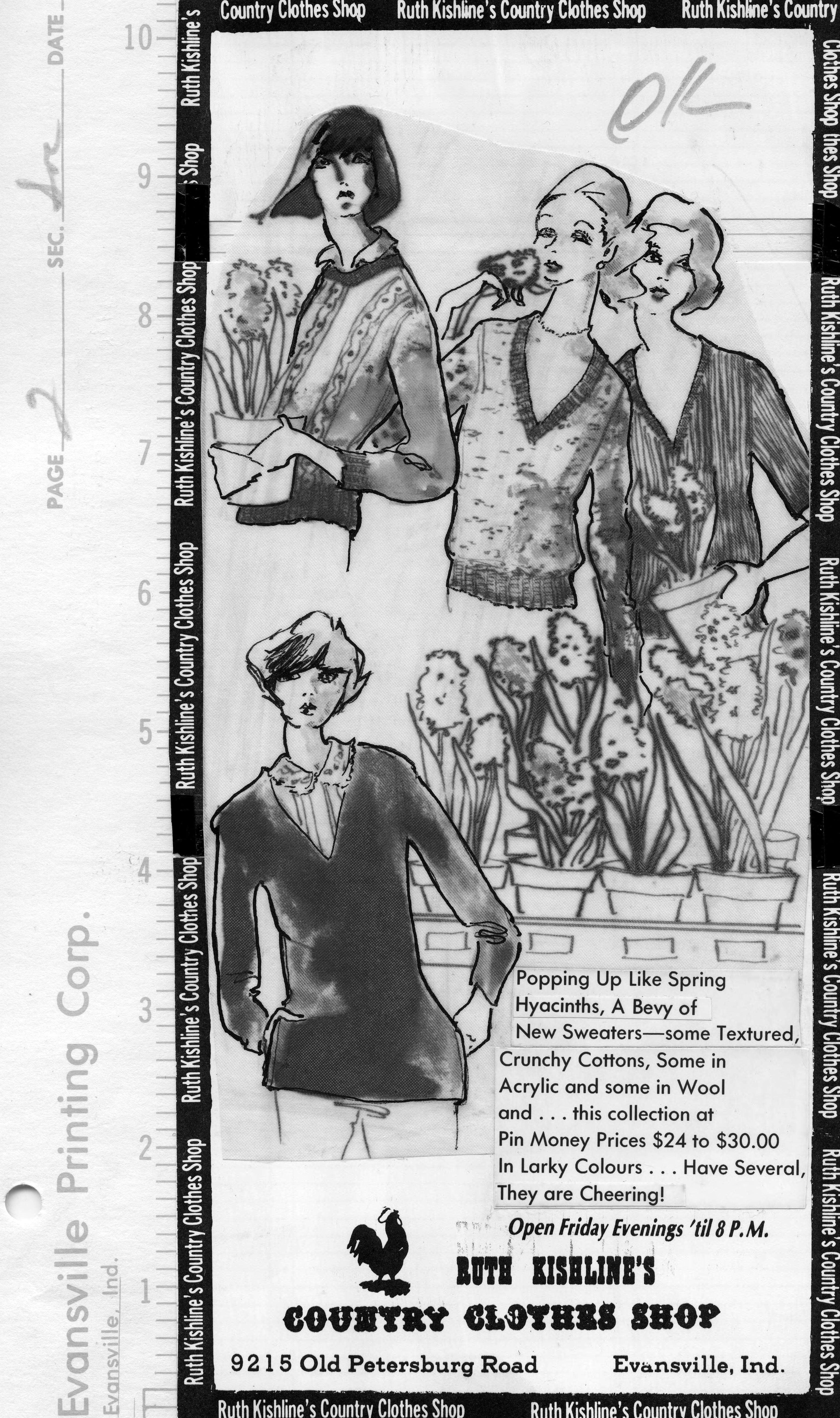 Sketch of 4 women wearing sweaters, 3 V-neck and one a crew neck. The illustration also includes potteed flowers. This is the cut out of the advertisement, and the copy reads, Popping up like Spring Hyacinths, A Bevy of New Sweaters--some Textured, Crunchy Cottons, Some in Acrylic and some in Wool and ...this collection at Pin Money Prices $24 to $30.00 in Larky Colours...Have Several, They are Cheering! The text also includes the name of the store, the address, and Friday hours.