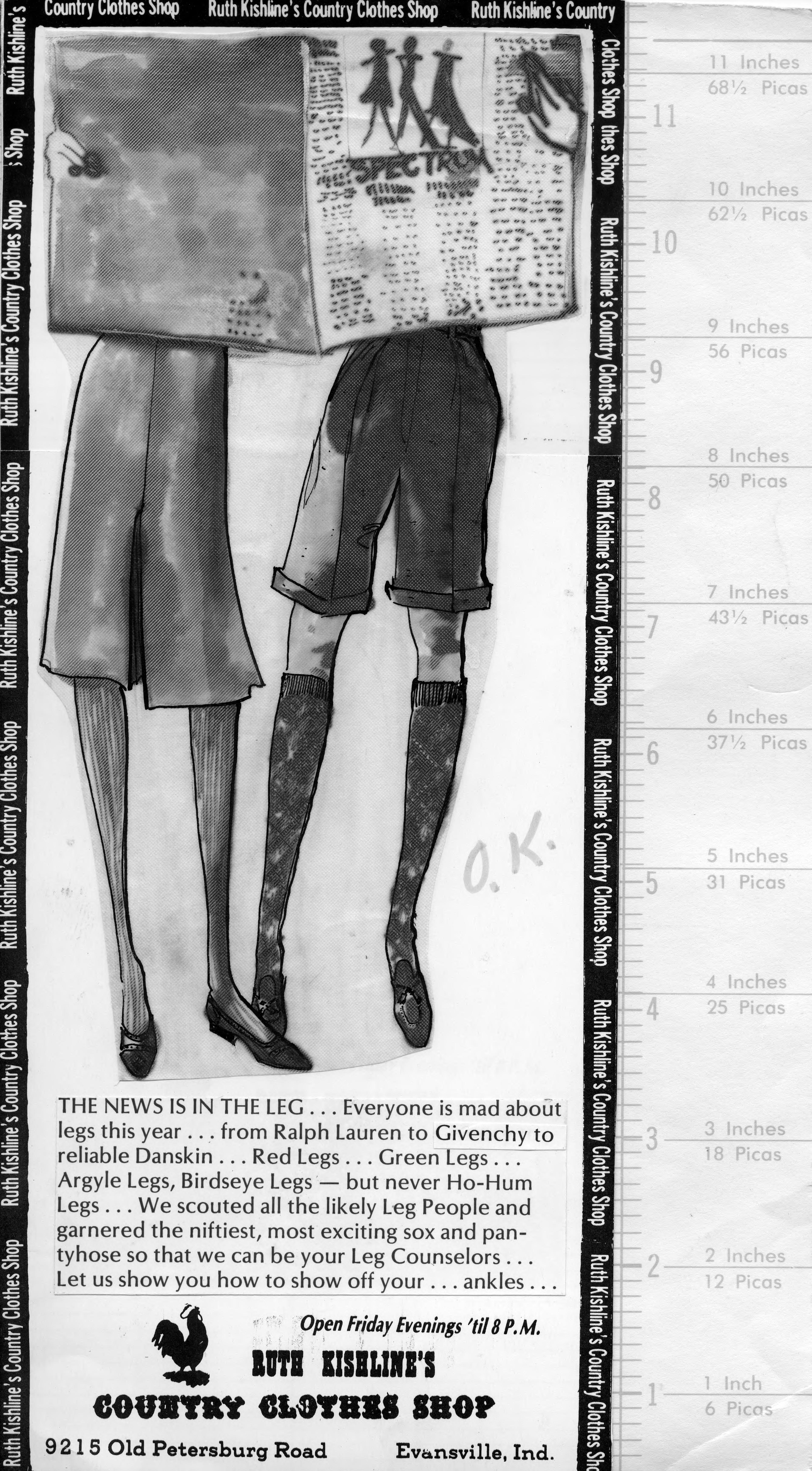Sketch of 2 people behind an open newspaper wearing a divided skirt and shorts, with decorative hose and socks. This is the cut out of the advertisement, and the copy reads, The news is in the leg�Everyone is mad about legs this year...from Ralph Lauren to Givenchy to reliable Danskin...Red Legs...Green Legs...Argyle Legs, Birdseye Legs--but never Ho-Hum Legs...We scouted all the likely Leg People and garnered the niftiest, most exciting sox and pantyhouse so that we can be your Leg Counselors...Let us show you how to show off your...ankles... The text also includes the name of the store, the address, and Friday hours.