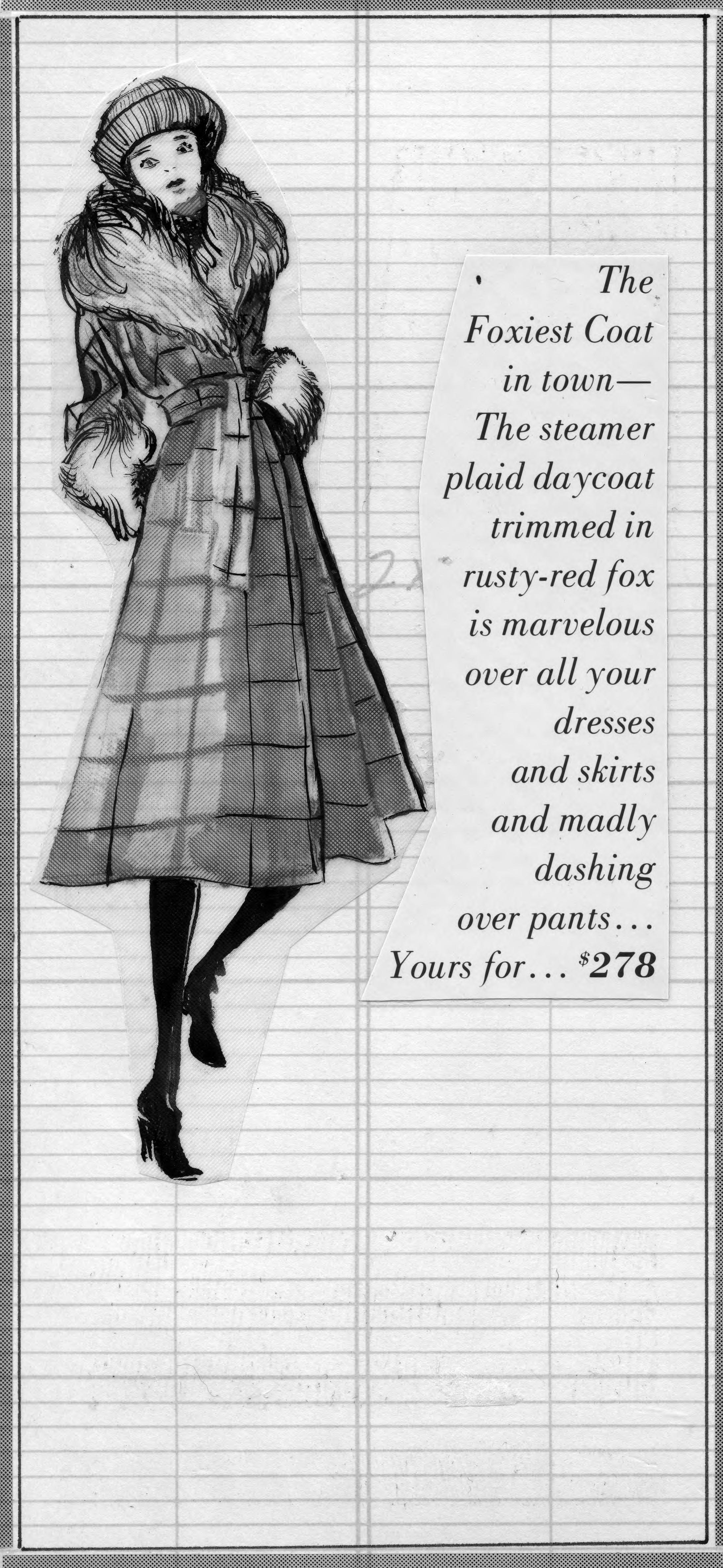 Sketch of a woman wearing a Winter coat, about knee-length, with fur shawl collar and fur at the cuffs. She also has a knitted hat. This is the cut-out of the advertisement, and the copy reads, The Foxiest Coat in town--The steamer plaid day coat trimmed in rusty-red fox is marvelous over all your dresses and skirts and madly dashing over pants....Yours for...$278.