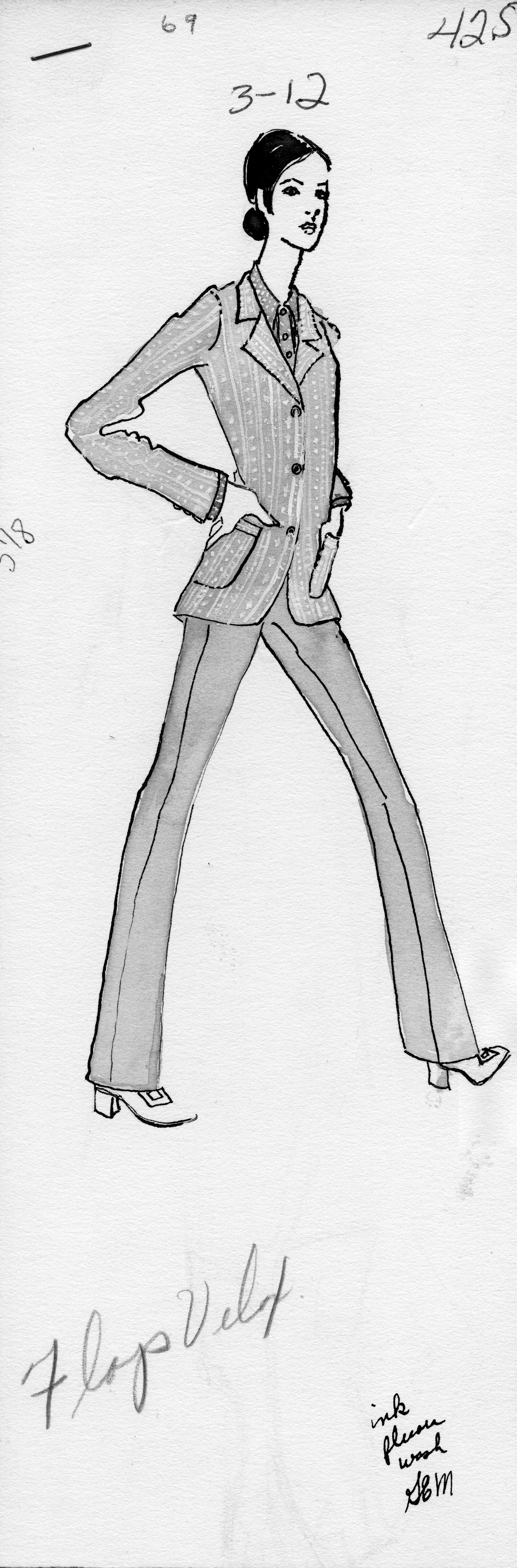 Sketch of a woman wearing a pantsuit, the jacket patterned and the pants plain.