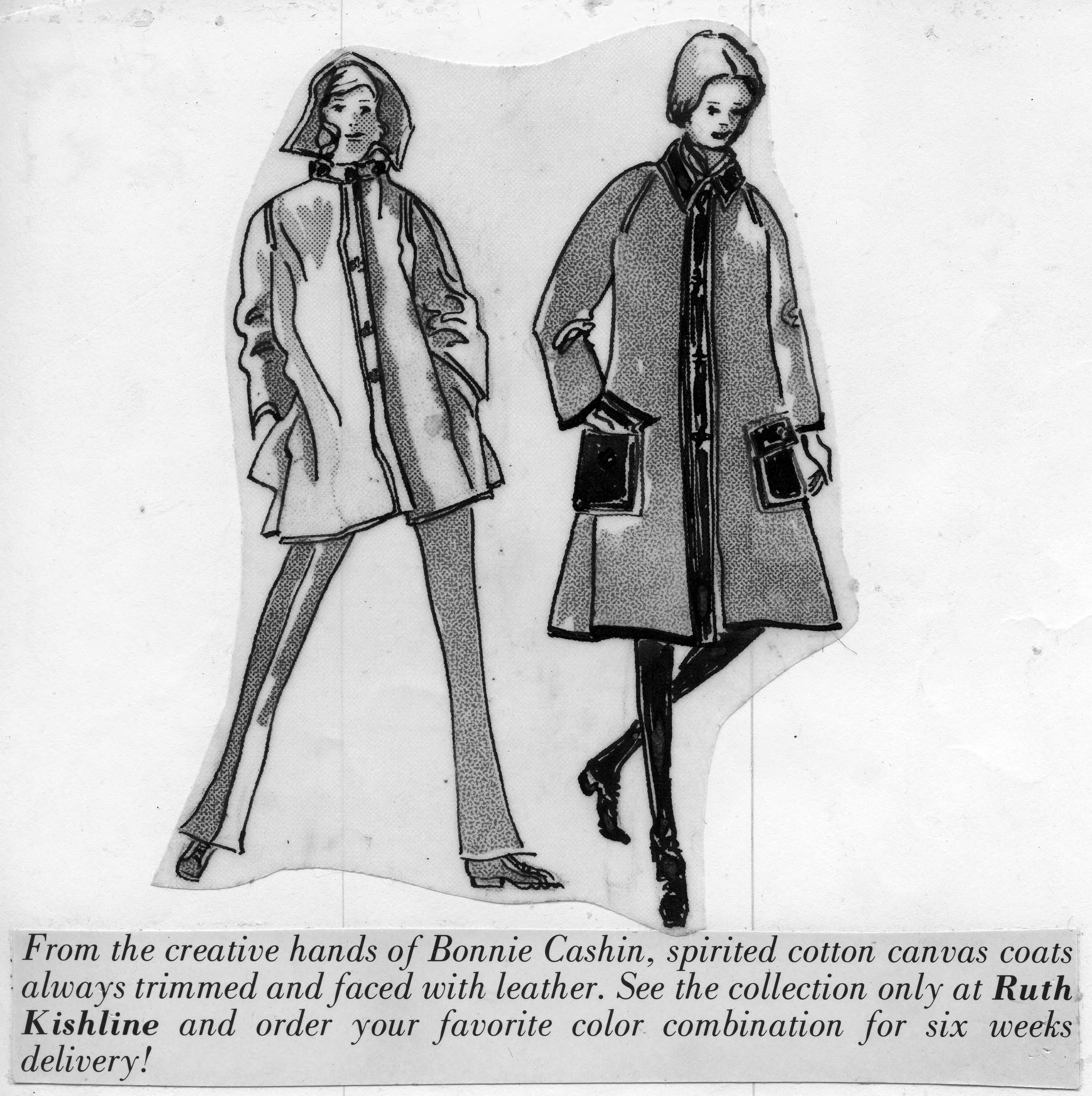 Sketch of 2 women wearing coats, one hip length, full, with a stand up collar, the other also full, knee length, with contrasting pockets, collar, and button placket. This is the cut-out of the advertisement, and the copy reads, From the creative hands of Bonnie Cashin, spirited cotton canvas coats always trimmed and faced with leather. See the collection only at Ruth Kishline and order your favorite color combination for six weeks delivery! Bonnie Cashin (September 28, ca. 1908� February 3, 2000) was an American designer and is considered one of the pioneering designers of American sportswear. She created practical, uncomplicated clothing that catered to the independent woman of the post-war era. . Cashin is often cited creating both the concept of layering clothing and for coining the term. The idea of layering came from time she spent in Asia. Her use of leather, mohair and hardware was pioneering and the brass turnlocks that kept the top of her 1940s convertible down became a signature feature of Coach handbags.
