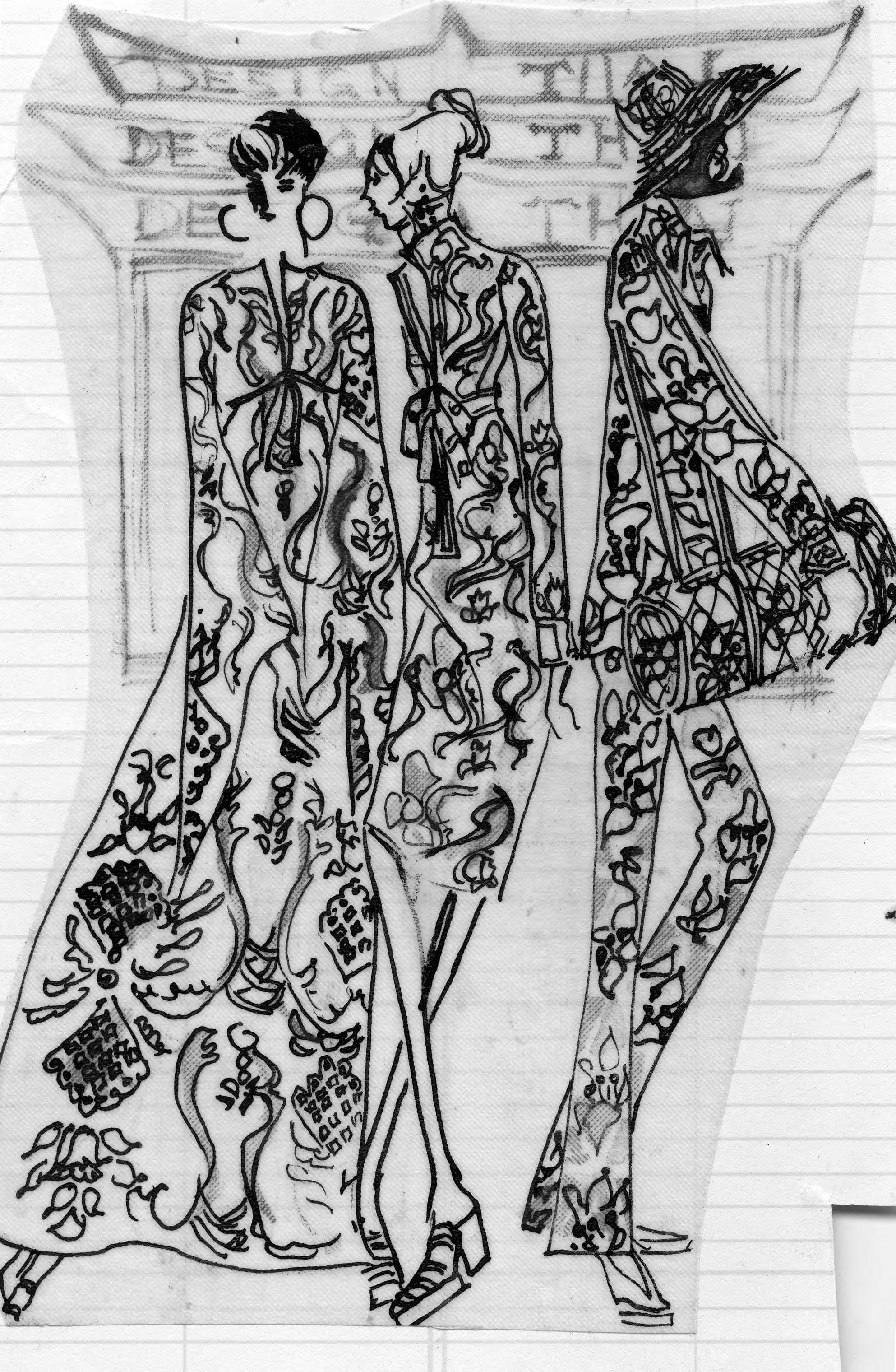 Sketch of 3 women wearing Asian-motif clothing--a caftan with pointed sleeves and empire waist, a below the knee length long-sleeved dress with a Mandarin collar, and a pantsuit and matching hat and bag.