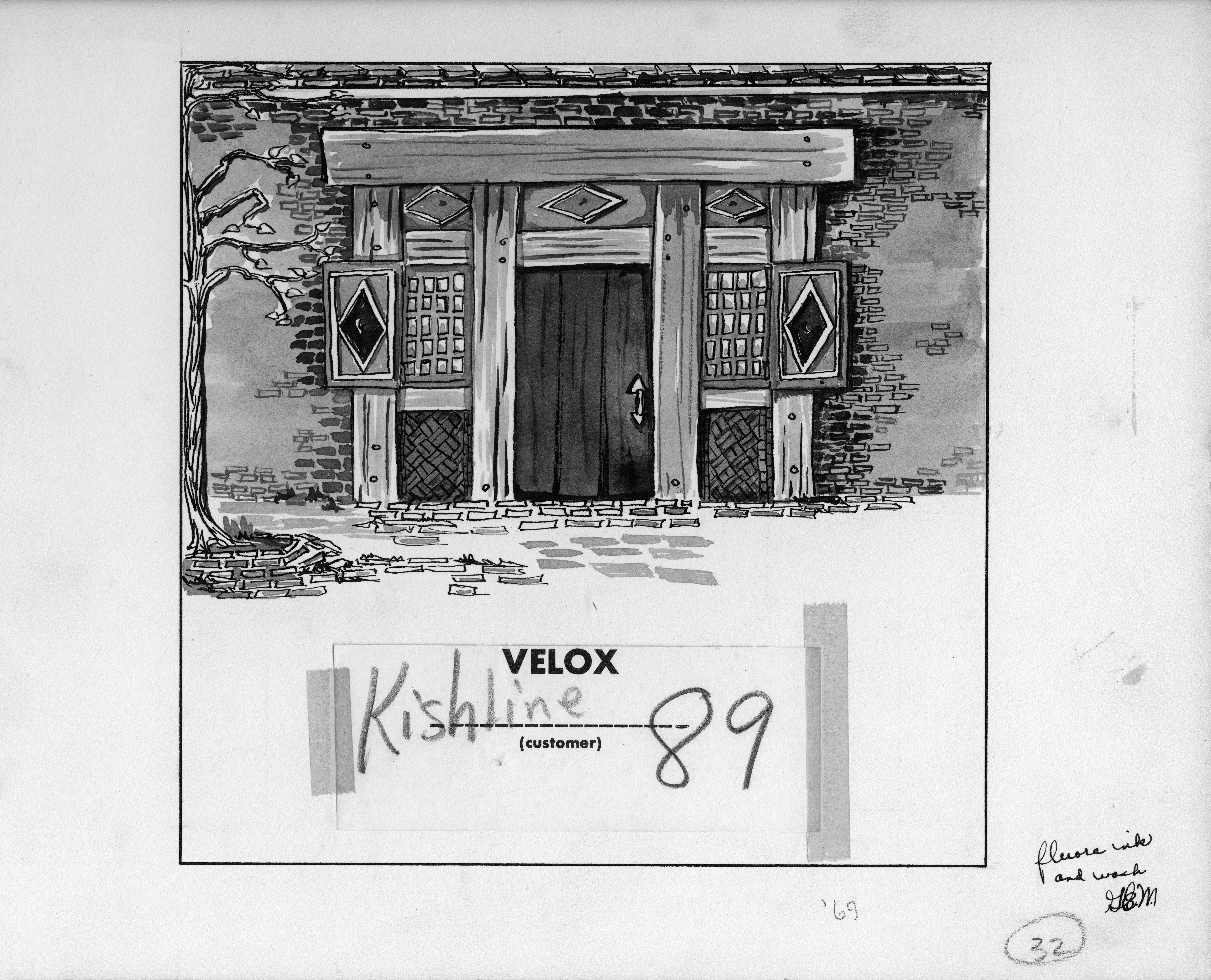 Sketch of an ornate entryway. The text on the back, possibly the advertising copy, reads, A new door of fashion will swing wide to welcome you soon. This might have been the entrance to one of the originator's, Ruth Kishline, stores in Mt. Vernon or McCutchanville, Indiana.