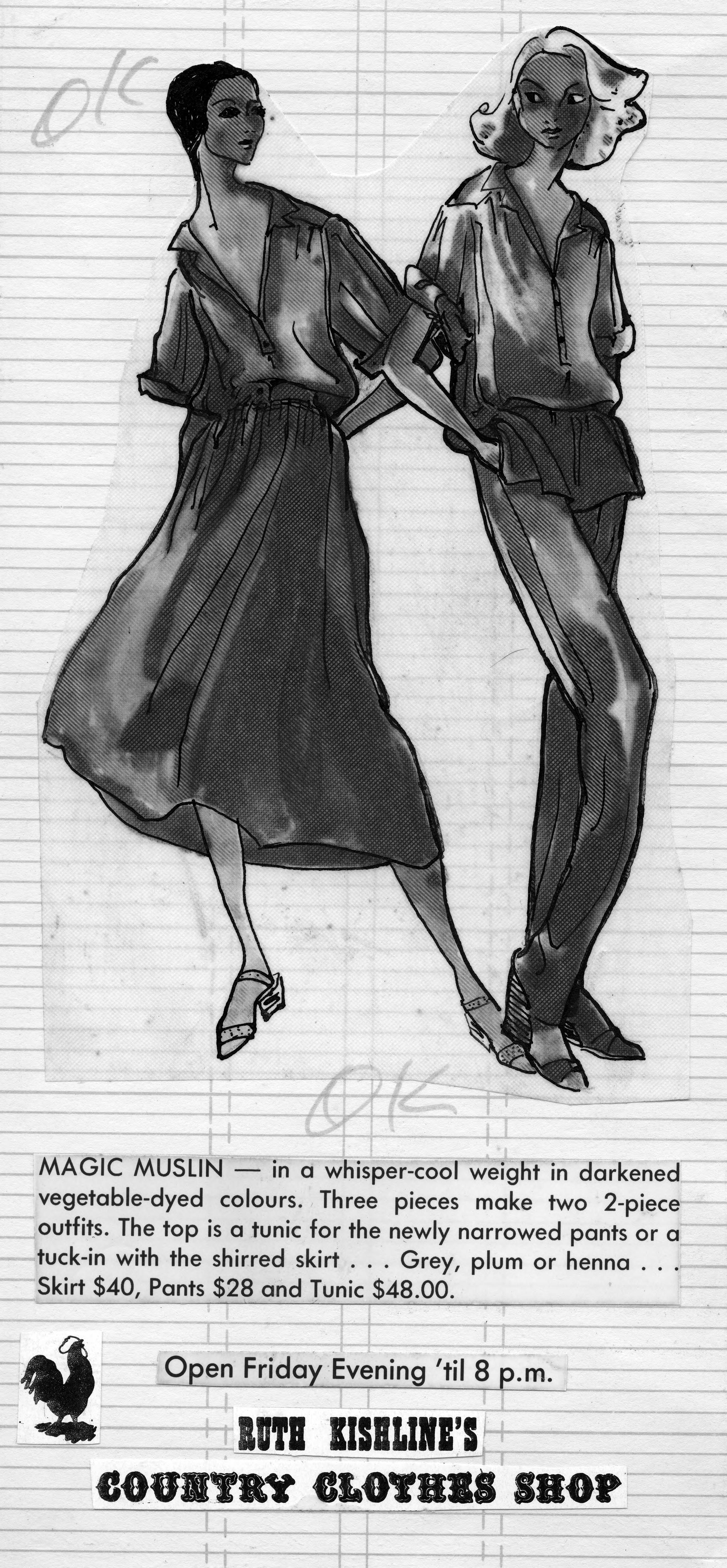 Sketch of 2 women, both wearing the same tunic top with rolled-up sleeves, one tucked in a skirt and the other over pants. This is the cut out of the advertisement, and the copy reads, Magic Muslin--in a whisper-cool weight in darkened vegetable-dyed colours. Three pieces make two 2-piece outfits. The top is a tunic for the newly narrowed pants or a tuck-in with the shirred skirt...Grey, plum, or henna...Skirt $40, Pants $28 and Tunic $48.00. The text also includes the name of the store and Friday hours.