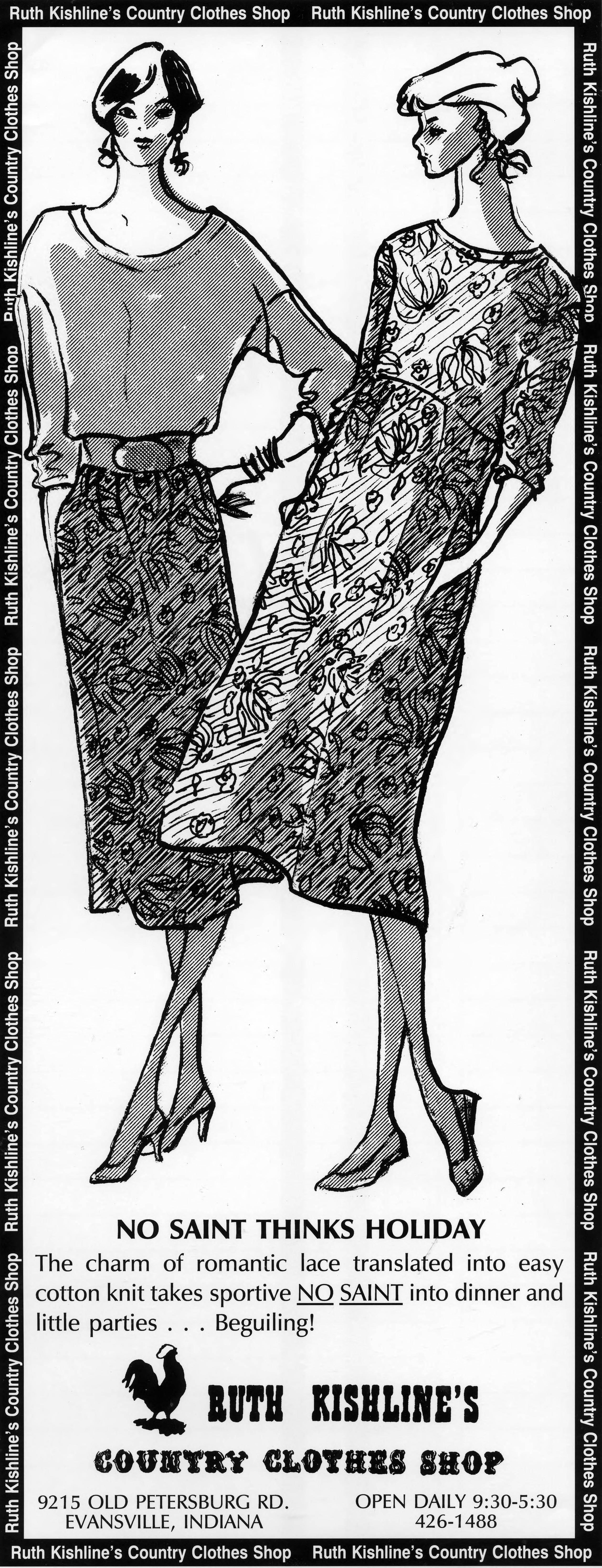 Sketch of 2 women wearing a a blouse with skirt and an Empire-style dress, same fabric as the skirt. This is the cut out of the advertisement, and the copy reads, No Saint thinks holiday. The charm of romantic lace translated into easy cotton knit takes sportive No Saint into dinner and little parties...Beguiling! The text also includes the name of the store, the address, and regular hours. The date of 10-20 is written on the back.