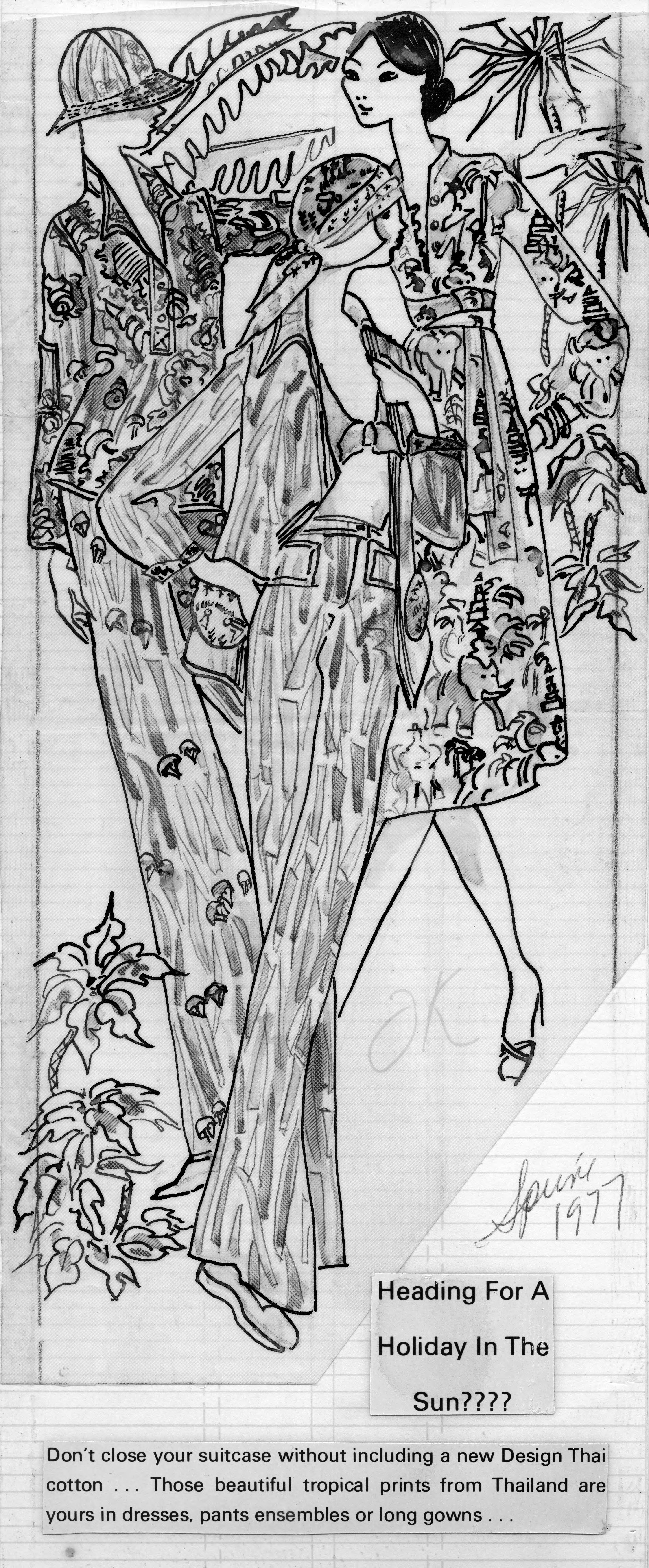 Sketch of 3 women in a tropical setting, searing a pantsuit, another pant suit and bikini top, and a long-sleeved dress. This is the cut out of the advertisement, and the copy reads, Headinf for a holiday in the sun???? Don't close your suitcase without including a new Design Thai cotton...Those beautiful tropical prints from Thailand are yours in dresses, pants ensembles or long gowns... On the front is written Spring 1977.