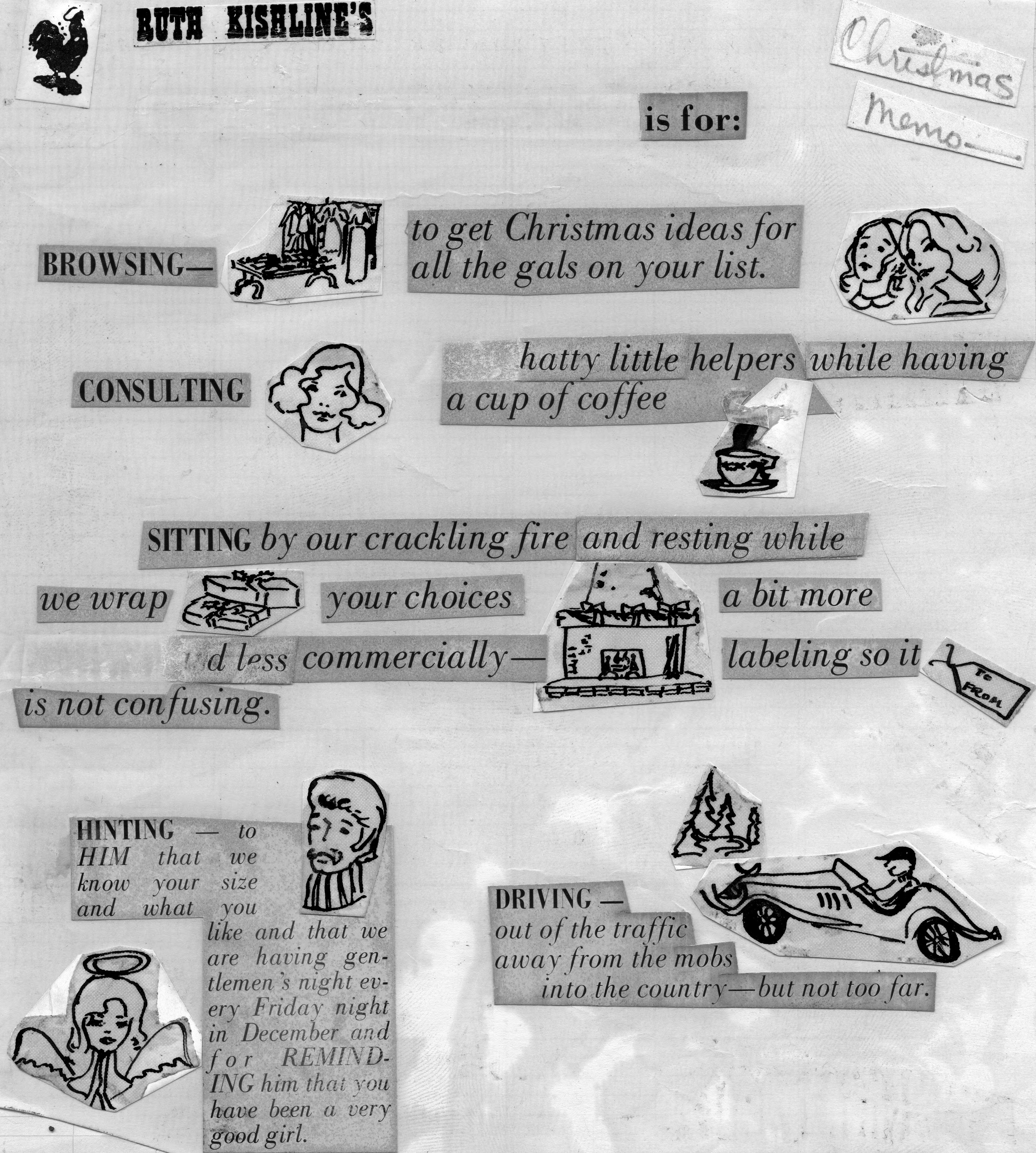Sketch of a Christmas advertisement, mostly words with some small illustrations. This is the cut out of the advertisement, and the copy reads, Christmas Memo-- [text lost] is for: Browsing--to get Christmas ideas for all the gals on your list. Consulting [?]hatty little helpers while having a cup of coffee. Sitting by our crackling fire and resting while we wrap yoru choices a bit more ??? and less commercially--labeling so it is not confusing. Hinting--to HIM that we know your size and what you like and that we are having gentlemen's night every Friday night in December and for Reminding him that you have been a very good girl. Driving--out of traffic away from the mobs into the country--but not too far. On the back is the dimension 8 x 7 1/2.