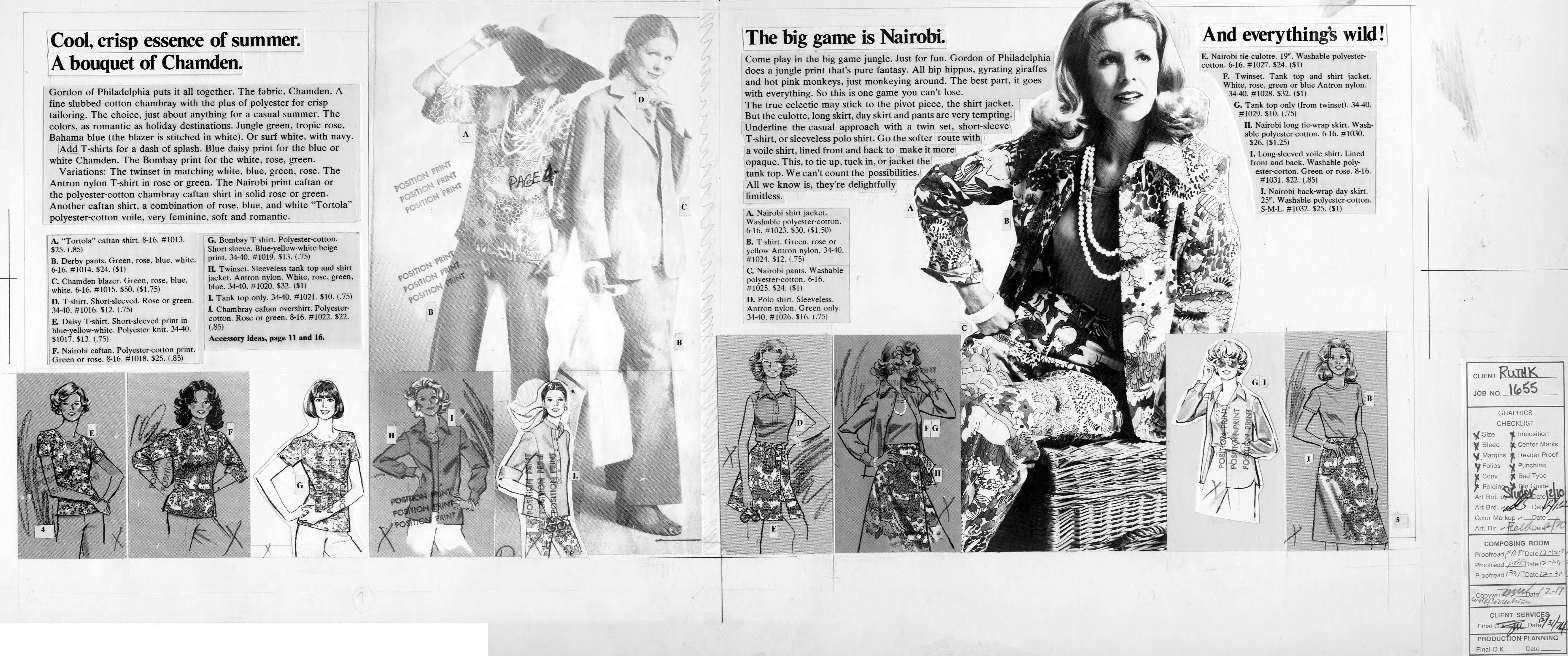 Advertsing layout in 4 (large) columns (actually, it's a two page spread) and two overlays, for pages 4 and 5 of a catalog. This layout is for Gordon of Philadelphia attire.