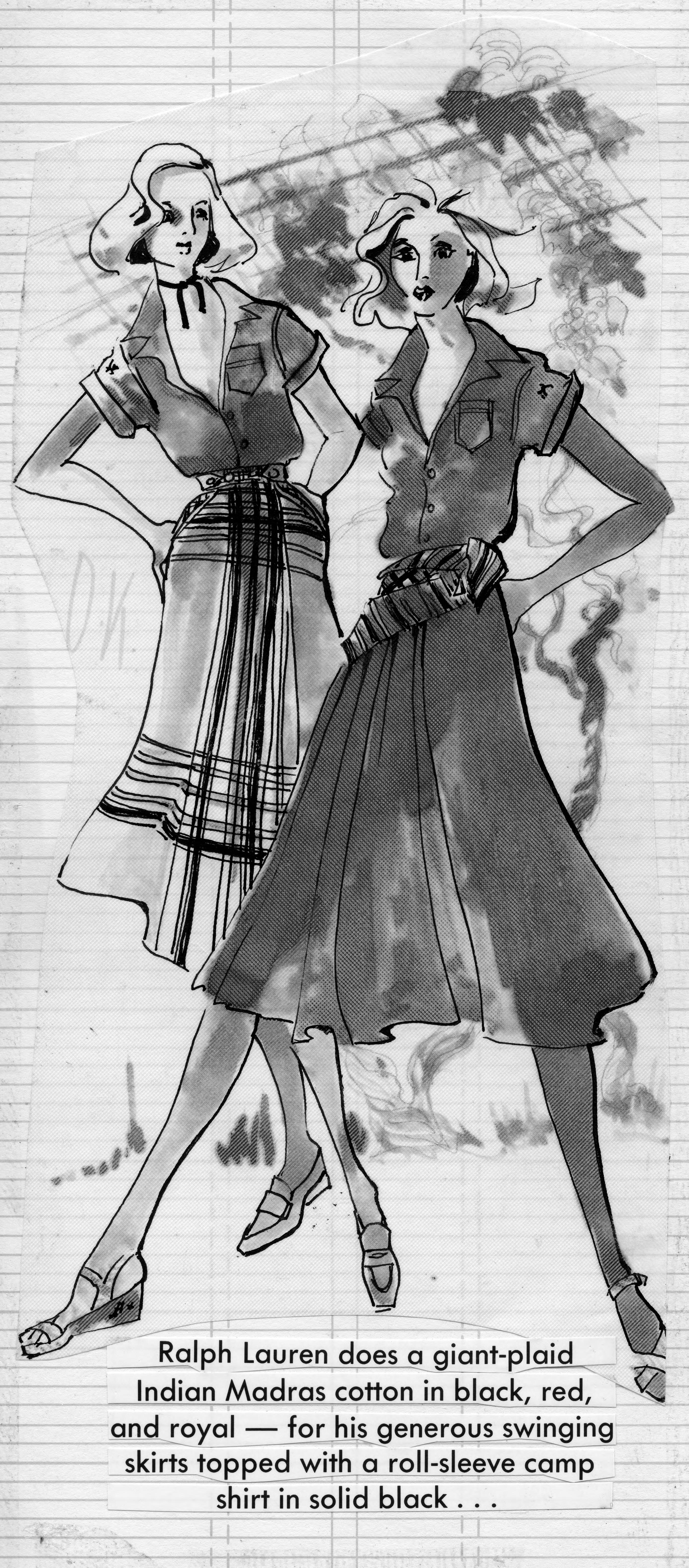 Sketch of 2 women wearing a short sleeved blouse with skirt and a shirtdress. This is the cut out of the advertisement, and the copy reads, Ralph Lauren does a giant-laid Indian Madras cotton in black, red, and royal--for his generous swinging skirts topped with a roll-sleeve camp shirt in solid black. The text also includes the name of the store on the back along with Summer 1977. Ralph Lauren (born Ralph Lifshitz; October 14, 1939) is an American fashion designer, philanthropist, and business executive, best known for the Ralph Lauren Corporation, a global multibillion-dollar enterprise. .From 1962 to 1964 he served in the United States Army and left to work briefly for Brooks Brothers as a sales assistant before becoming a salesman for a tie company. The Ralph Lauren Corporation started in 1967 with men's ties. At 28 years old, Lauren worked for the tie manufacturer Beau Brummell, where he convinced the company's president to let him start his own line. Drawing on his interests in sports, Ralph Lauren named his first full line of menswear �Polo' in 1968. He worked out of a single drawer from a showroom in the Empire State Building and made deliveries to stores himself. By 1969, the Manhattan department store Bloomingdale's sold Lauren's men line exclusively. It was the first time that Bloomingdale's had given a designer their own in-store boutique. In 1971, Ralph Lauren Corporation launched a line of tailored shirts for women, which introduced the Polo player emblem to the world for the first time, appearing on the shirt's cuff. The first full women's collection was launched the following year. 1971 also marked the opening of Ralph Lauren's store on Rodeo Drive in Beverly Hills, California. This is the first freestanding store for an American designer. In 1972 the Ralph Lauren Corporation introduced a signature cotton mesh Polo shirt in various colors. Featuring the polo player logo at the chest, the shirt became emblematic of the preppy look--one of Ralph Lauren's signature styles. The tagline for the ad campaign was: Every team has its color � Polo has seventeen.