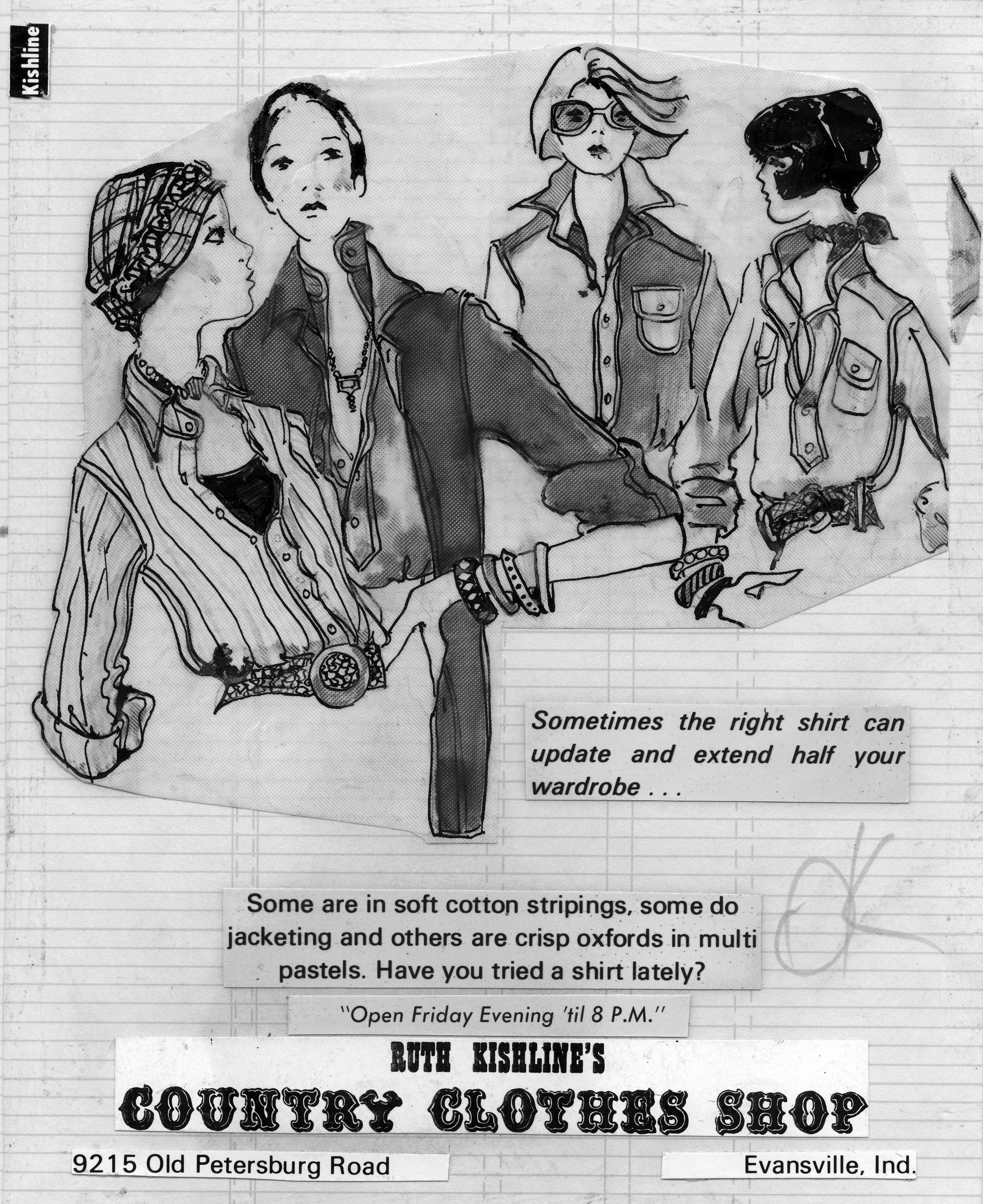 Sketch of 4 women wearing long sleeved shirts. This is the cut out of the advertisement, and the copy reads, Sometimes the right shirt can update and extend half your wardrobe�Some are in soft cotton stripings, some do jacketing and others are crisp oxfords in multi pastels. Have you tried a shirt lately? The text also includes the name of the store, address, and Friday hours. On the back is written Summer 1976.