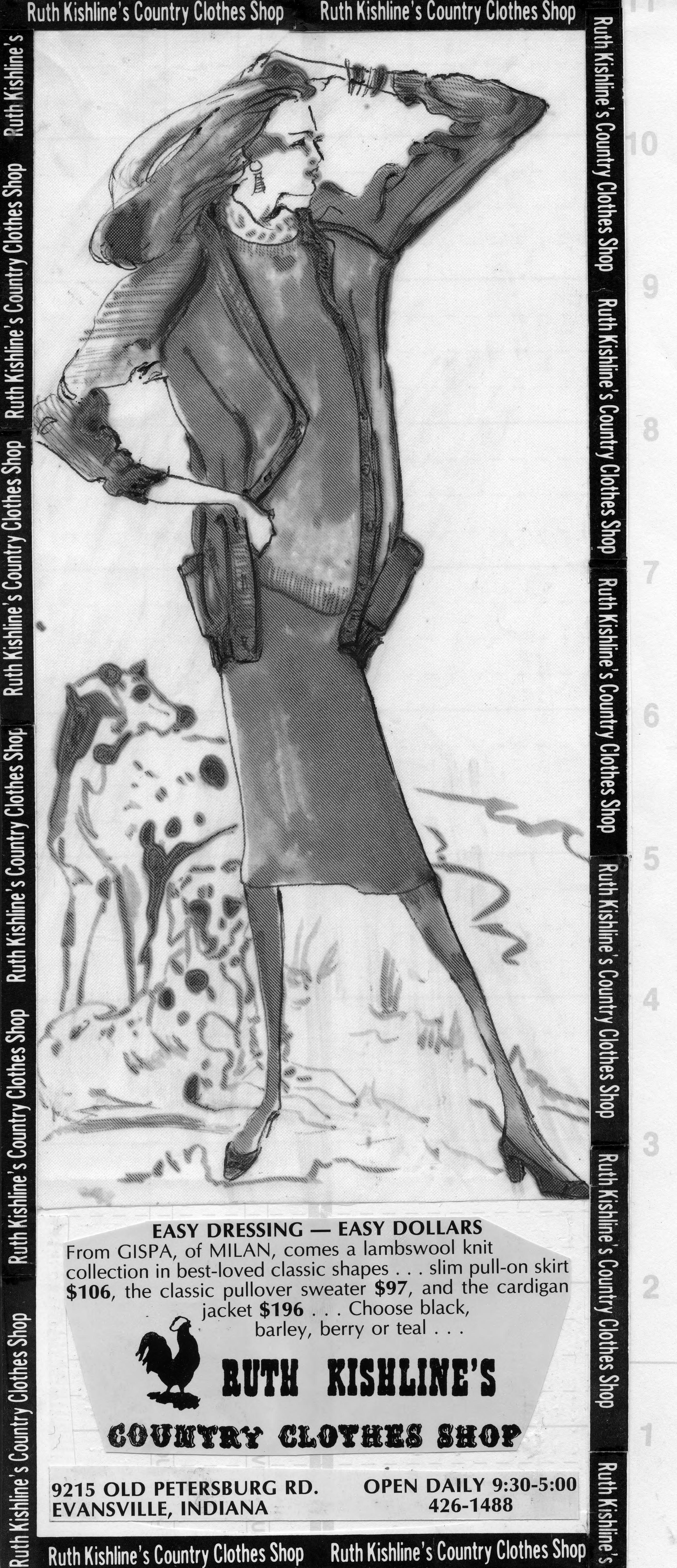 Sketch of a woman wearing a sweater set with skirt, with 2 dogs in the illustration's background. This is the cut out of the advertisement, and the copy reads, Easy dressing--easy dollars. From Gispa, of Milan, comes a lambswool knit collection in best-loved classic shapes...slim pull-on skirt $106, the classic pullover sweater $97, and the cardigan jacket $196...Choose black, barley, berry or teal... The text also includes the name of the store, the address, and regular hours. The date of October 1, 1989 is stamped on the back.
