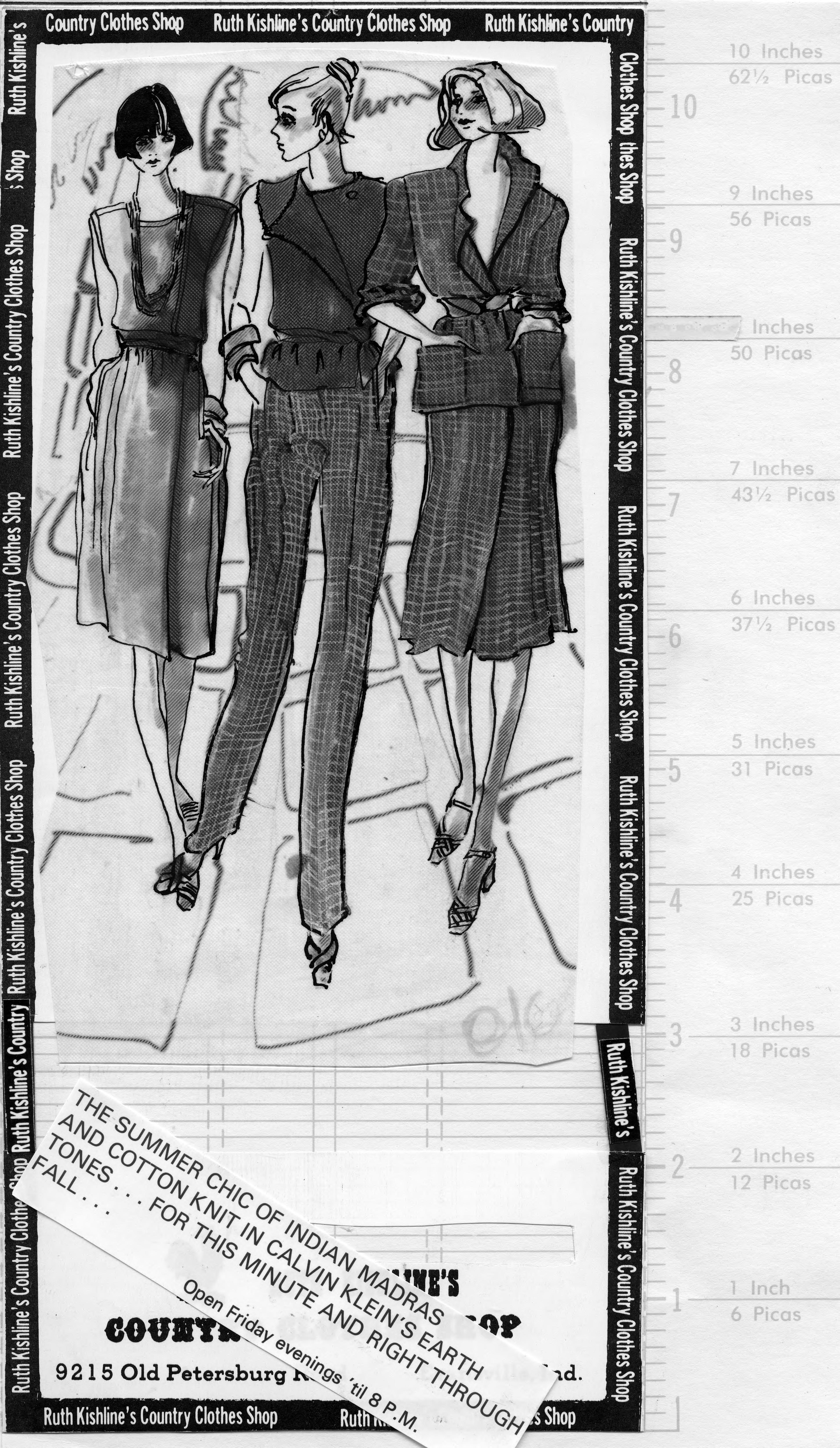 Sketch of 3 women wearing a long sleeved dress, jacket and pants, and jacket and skirt. The fabric of the pants and the jacket and skirt are the same. This is the cut out of the advertisement, and the copy reads, The summer chic of Indian Madras and cotton knit in Calvin Klein's earth tones...for this minute and right through fall... The text also includes the name of the store, the address, and Friday hours. Calvin Klein is a global lifestyle brand that exemplifies bold, progressive ideals and a seductive, and often minimal, aesthetic. We seek to thrill and inspire our audience while using provocative imagery and striking designs to ignite the senses. After nearly 50 years, Calvin Klein continues to be a cultural catalyst across the globe by embracing tension, sparking ideas and creating unforeseen realities. We believe in a culture that provokes discovery and brave thinking. We strive to make a positive impact on the world. We inspire passion in our people. We embody authenticity and embrace individuality. Founded in 1968 by Calvin Klein and his business partner Barry Schwartz, we have built our reputation as a leader in American fashion through our clean aesthetic and innovative designs. Global retail sales of Calvin Klein products exceed $8 billion in 2015 and were distributed in [over] 110 countries. Calvin Klein employs over 10,000 associates globally. In 2003, we were acquired by PVH Corp., one of the largest apparel companies in the world. With a history going back over 130 years, PVH has excelled at growing brands and businesses with rich American heritages, becoming one of the largest global apparel companies. We have over 30,000 associates operating in over 40 countries with over $8 billion in revenues. We own the iconic Calvin Klein, Tommy Hilfiger, Van Heusen, IZOD, ARROW, Speedo*, Warner�s and Olga brands and market a variety of goods under these and other nationally and internationally known owned and licensed brands. (https://explore.calvinklein.com/en_US/corporate)