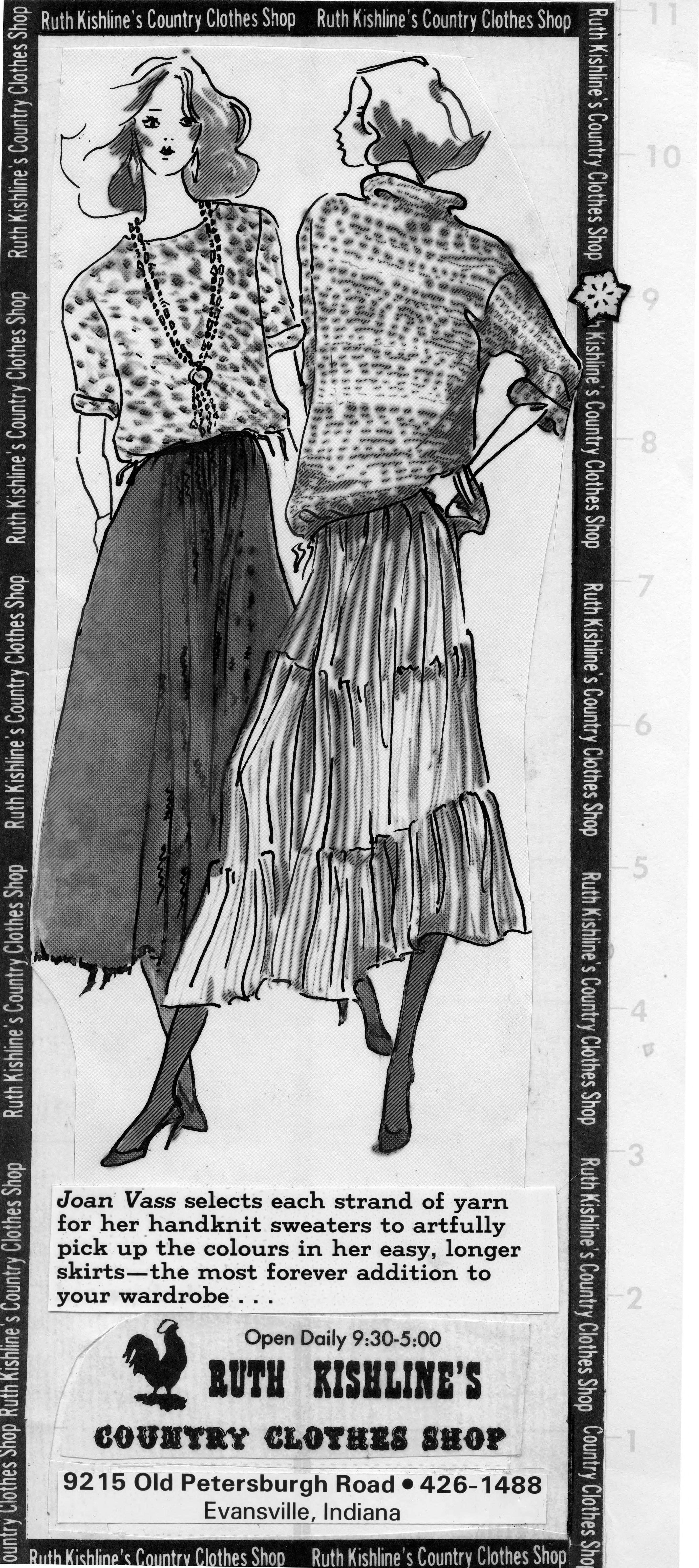 Sketch o2 women wearing sweaters and full skirts, one with tiers. This is the cut out of the advertisement, and the copy reads, Joan Vass selects each strand of yarn for her handknit sweaters to artfully pick up the colours in her easy, longer skirts--the most forever addition to your wardrobe... The text also includes the name of the store, the address, and regular hours. The date of January 4, 1988 is stamped on the back. �Drawing upon her education in philosophy and aesthetics, Joan Vass set out to work in the art world. Beginning as an assistant curator of drawing and prints at the Museum of Modern Art, she then went on to edit art tomes for Harry N. Abrams and as a contributing columnist for Art in America. It was during this time that Joan developed an interest in hand knits & crochets. She tapped into the skills of local women to produce her first designs. This collection, consisting of hats & mufflers, was bought by arbiter of fashion, Henri Bendel. It quickly sold out, changing Joan�s career from observer of art to creator of art. Incorporated in 1977, her eponymous collection expanded into sweaters for both sexes. Using the same local artisans, the designs were unique, limited and beautifully crafted. Demand for Joan�s quirky unstructured knitwear grew during the 1980�s prompting large scale production at Signal Knitting Mills in South Carolina under the label Joan Vass USA. Encompassing all the components of a complete wardrobe � sweaters, trousers, skirts & dresses, the aesthetic remained the same, with fine fabrics, natural fibers and ageless designs. Joan�s unique approach, that of eliminating the excess, leaving a timeless, seasonless collection garnered her many accolades, including the Extraordinary Women in Fashion award from the Smithsonian Institute, Coty American Fashion Critics award and the Prince Machiavelli Prix de Cachet award. The Joan Vass brand continues today with renewed attitude. Building on the tradition of luxurious knitwear since its inception over thirty years ago, this is a collection of understated elegance. Classic silhouettes have been modernized using fabrics that envelop the body in comfortable luxury. Soft silk cashmere sweaters, multidimensional knit jacquards, jerseys and interlocks are styled in ways that pay tribute to the unique aesthetic that is Joan Vass.� (https://joanvass.com/pages/about-us)