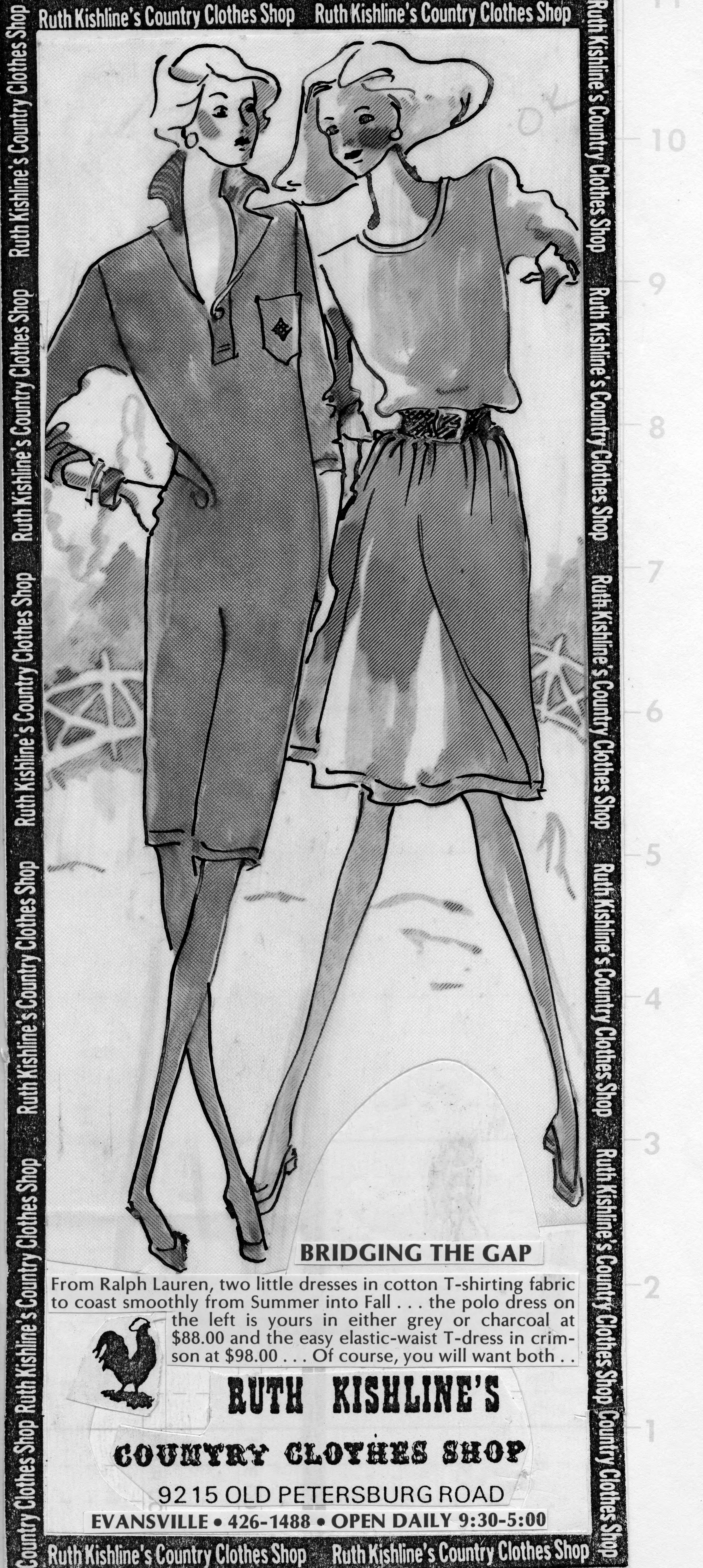 Sketch of 2 women wearing knit dresses. This is the cut out of the advertisement, and the copy reads, Bridging the Gap. From Ralph Lauren, two little dresses in cotton T-shirting fabric to coast smoothly from Summer into Fall..the polo dress on the left is yours in either grey or charcoal at $88.00 and the easy elastic waist T-dress in crimson at $98.00.Of course, you will want both. The text also includes the name of the store, the address, and regular hours. On the back is stamped the date of June 26, 1988. Ralph Lauren (born Ralph Lifshitz; October 14, 1939) is an American fashion designer, philanthropist, and business executive, best known for the Ralph Lauren Corporation, a global multibillion-dollar enterprise. .From 1962 to 1964 he served in the United States Army and left to work briefly for Brooks Brothers as a sales assistant before becoming a salesman for a tie company. The Ralph Lauren Corporation started in 1967 with men's ties. At 28 years old, Lauren worked for the tie manufacturer Beau Brummell, where he convinced the company's president to let him start his own line. Drawing on his interests in sports, Ralph Lauren named his first full line of menswear �Polo' in 1968. He worked out of a single drawer from a showroom in the Empire State Building and made deliveries to stores himself. By 1969, the Manhattan department store Bloomingdale's sold Lauren's men line exclusively. It was the first time that Bloomingdale's had given a designer their own in-store boutique. In 1971, Ralph Lauren Corporation launched a line of tailored shirts for women, which introduced the Polo player emblem to the world for the first time, appearing on the shirt's cuff. The first full women's collection was launched the following year. 1971 also marked the opening of Ralph Lauren's store on Rodeo Drive in Beverly Hills, California. This is the first freestanding store for an American designer. In 1972 the Ralph Lauren Corporation introduced a signature cotton mesh Polo shirt in various colors. Featuring the polo player logo at the chest, the shirt became emblematic of the preppy look--one of Ralph Lauren's signature styles. The tagline for the ad campaign was: Every team has its color � Polo has seventeen.