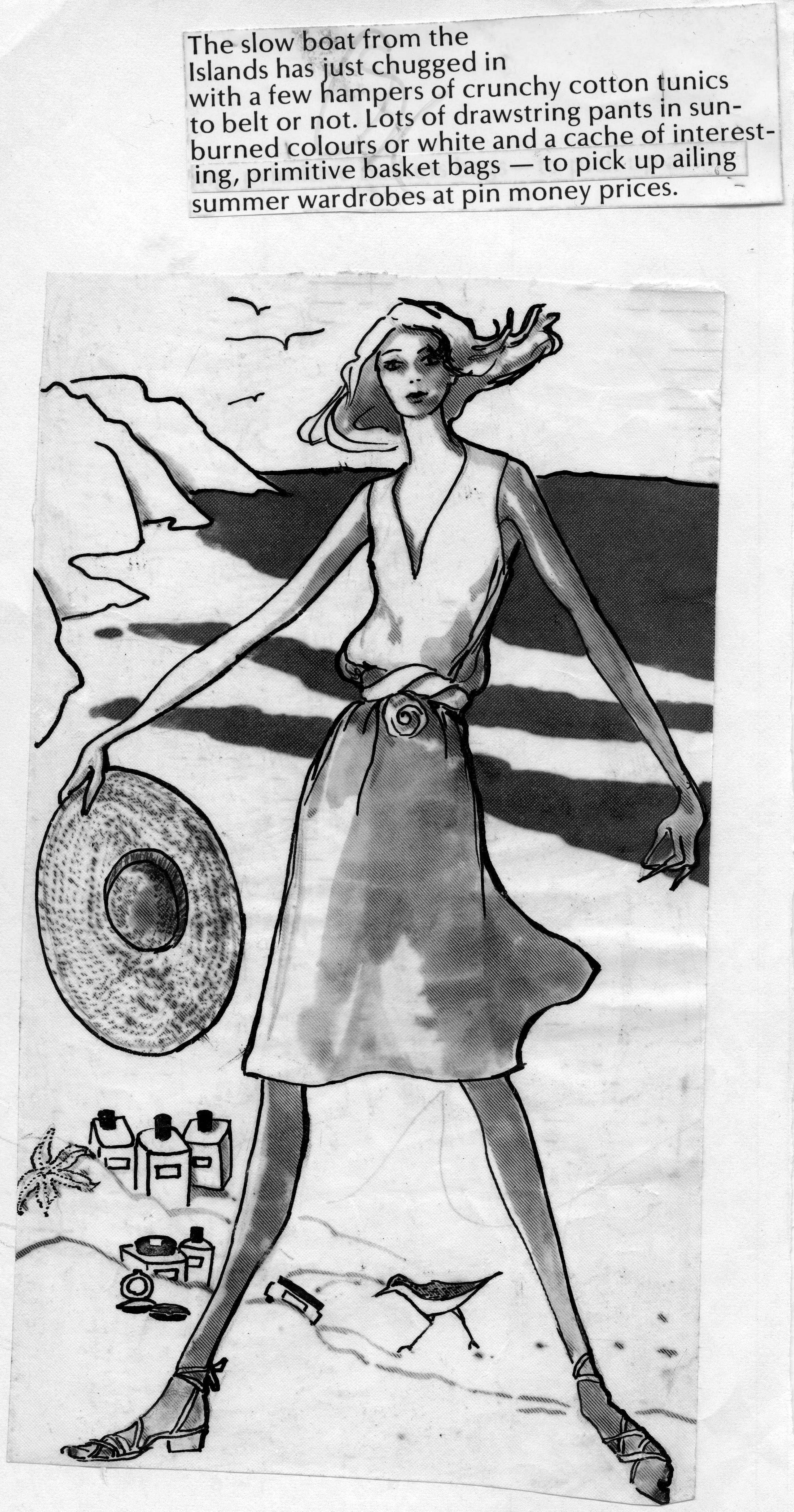 Sketch of a woman wearing a V-necked, sleeveless blouse with skirt and decorative belt and holding a floppy hat hat. The illustration is a beach scene. This is the cut out of the advertisement, and the copy reads, The slow boat from the Islands has just chugged in with a few hampers of crunchy cotton tunics to belt or not. Lots of drawstring pants in sun-burned colours or white and a cache of interesting, primitive basket bags--to pick up ailing summer wardrobes at pin money prices.