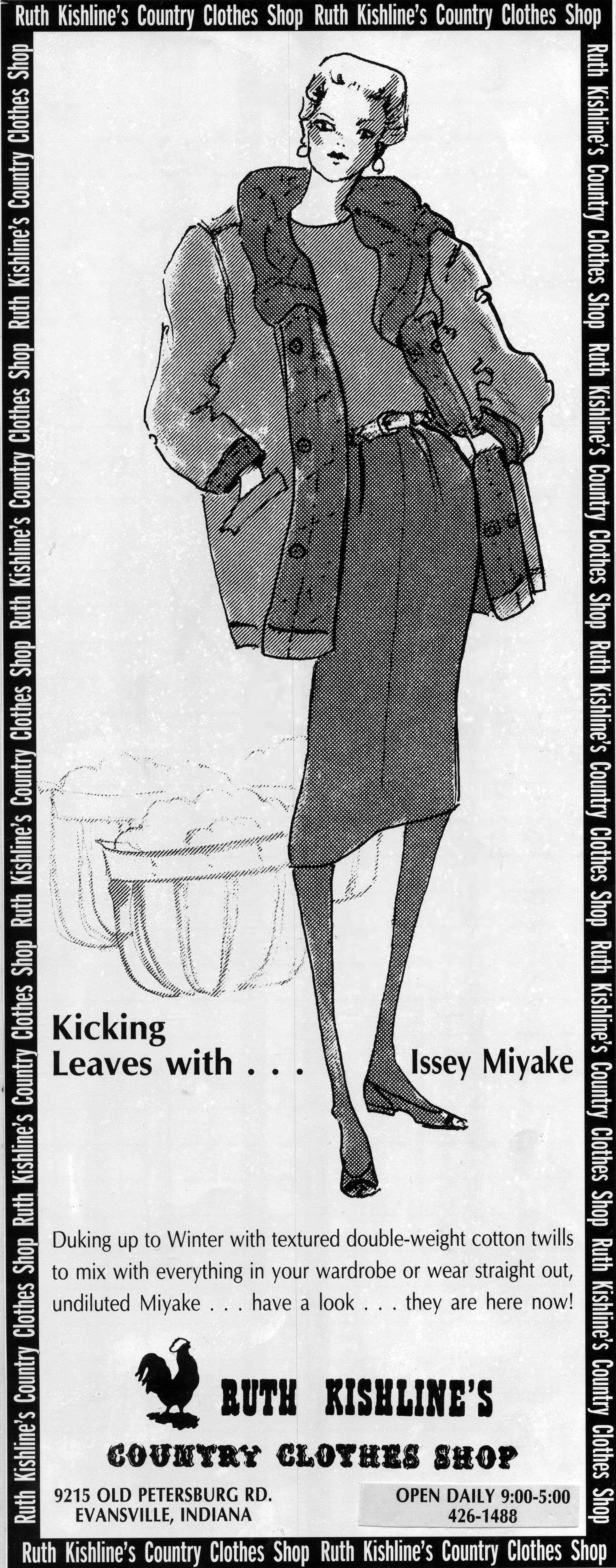 Sketch of a woman wearing a heavy jacket-coat with skirt. This is the cut out of the advertisement, and the copy reads, Kicking leaves with�Issey Miyake. Duking up to Winter with textured double-weight cotton twills to mix with everything in your wardrobe or wear straight out, undiluted Miyake.have a look.they are here now! The text also includes the name of the store, the address, and regular hours. The date of September 30, 1990 is written on the back. �Issey Miyake (born 22 April 1938) is a Japanese fashion designer. He is known for his technology-driven clothing designs, exhibitions and fragrances, such as L'eau d'Issey, which became his most well-known product.�
