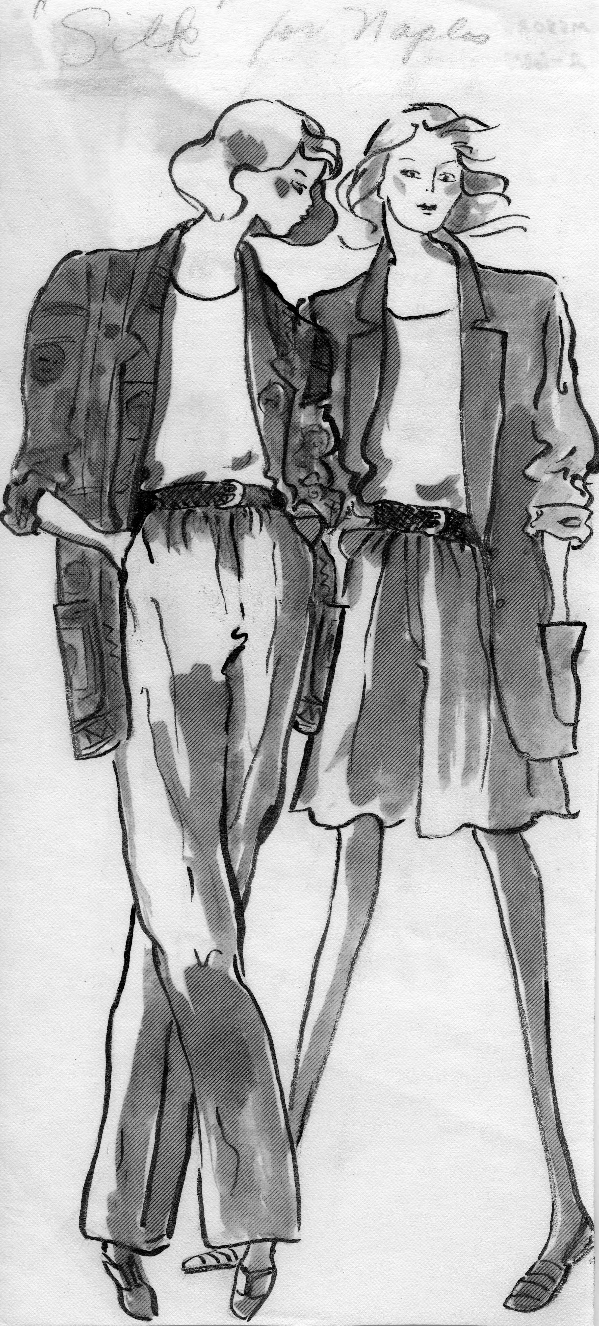 Sketch of 2 women wearing jackets with pants and skirt. This is the cut out of the advertisement but there is no copy, nor is it mounted on board as are others in the collection. Handwritten across the top is Silk for Naples.