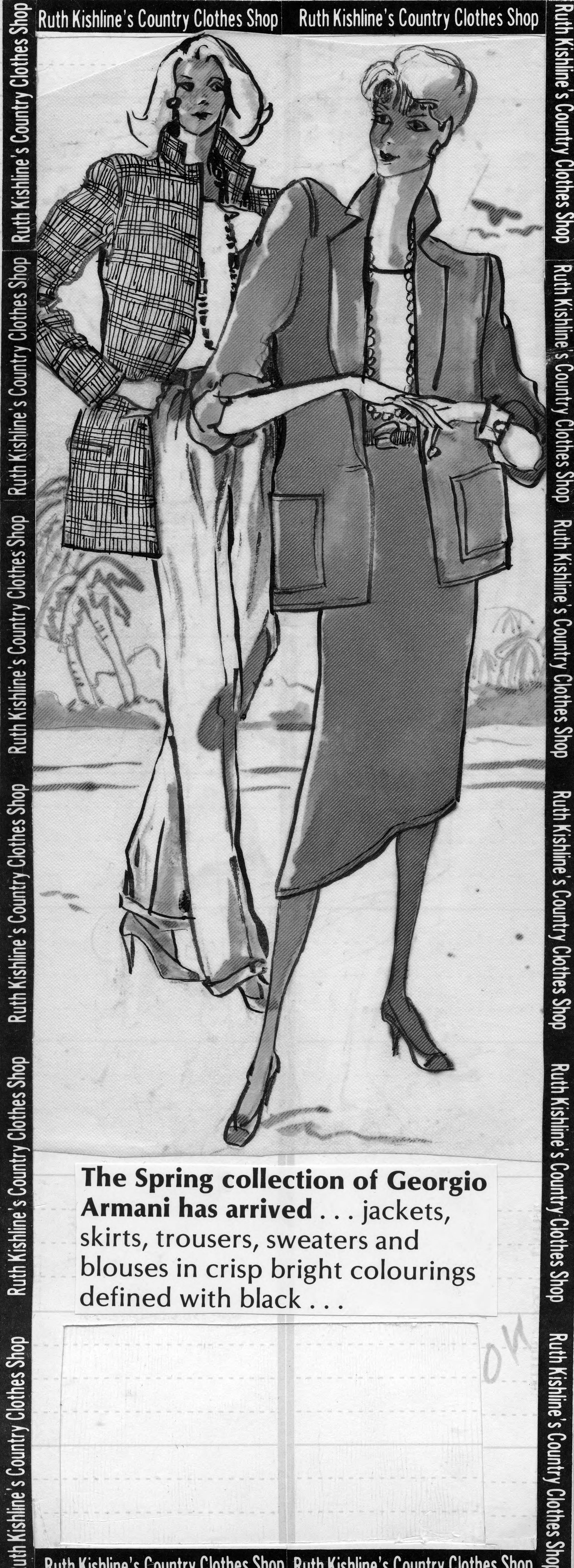 Sketch of 2 women wearing a jacket with pants and a business jacket with skirt. This is the cut out of the advertisement, and the copy reads, The Spring collection of Georgio [sic] Armani has arrived�jackets, skirts, trousers, sweaters and blouses in crisp bright colourings defined with black. The text also includes the name of the store. The date of 2-9 is written on the back. �Giorgio Armani (born 11 July 1934) is an Italian fashion designer. He is known today for his clean, tailored lines. He formed his company, Armani, in 1975, and by 2001 was acclaimed as the most successful designer of Italian origin, with an annual turnover of $1.6 billion and a personal fortune of $8.1 billion as of 2017. He is credited with pioneering red-carpet fashion.�