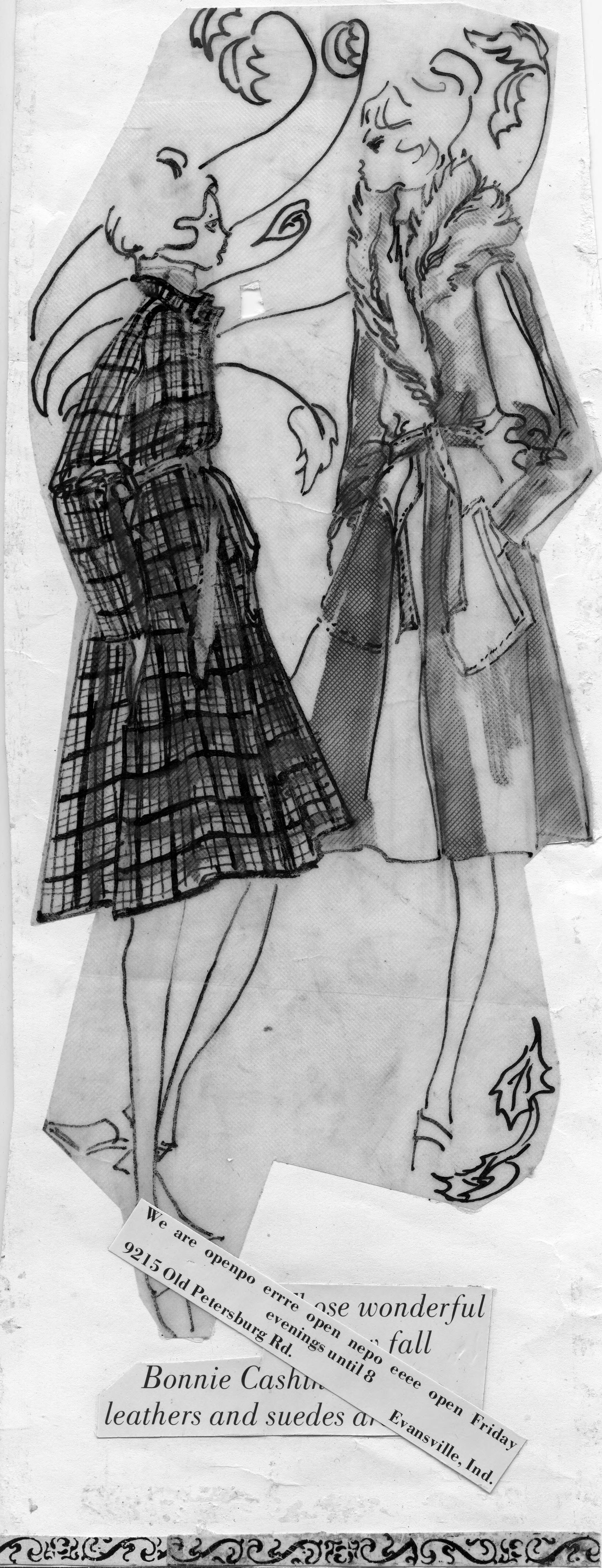 Sketch of 2 women wearing Winter coats, both knee length and with full skirts. One is plaid with possibly a Mandarin collar, and the other has fur around the neck. Both are tied at the waist. This the cut-out of an advertisement, and the copy reads, Those wonderful new Fall Bonnie Cashin tweeds, leathers and suedes are here.! It also contains the information that the store is open until 8 on Friday evenings (multiple typos in this text) and the address of the store at 9215 Old Petersburg Rd. in Evansville, Ind. Bonnie Cashin (September 28, ca. 1908� February 3, 2000) was an American designer and is considered one of the pioneering designers of American sportswear. She created practical, uncomplicated clothing that catered to the independent woman of the post-war era. . Cashin is often cited creating both the concept of layering clothing and for coining the term. The idea of layering came from time she spent in Asia. Her use of leather, mohair and hardware was pioneering and the brass turnlocks that kept the top of her 1940s convertible down became a signature feature of Coach handbags.