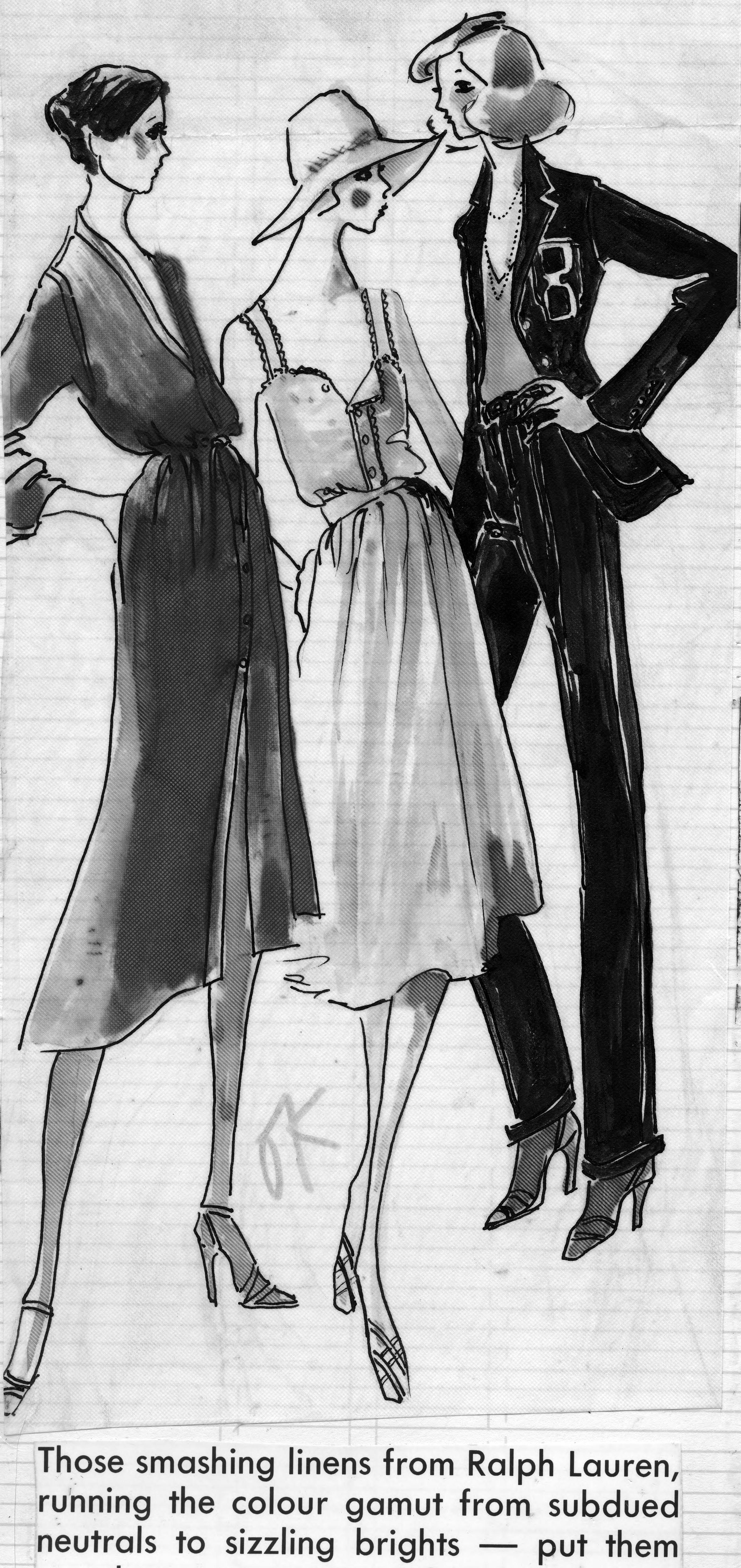 Sketch of 3 women, 2 wearing dresses (one with long sleeves, one sleeveless, and the other a pantsuit. This is the cut out of the advertisement, and the copy reads, Those smashing linens from Ralph Lauren, running the colour gamut from subdued neutrals to sizzling brights--put them together your own special way. Ralph Lauren (born Ralph Lifshitz; October 14, 1939) is an American fashion designer, philanthropist, and business executive, best known for the Ralph Lauren Corporation, a global multibillion-dollar enterprise. .From 1962 to 1964 he served in the United States Army and left to work briefly for Brooks Brothers as a sales assistant before becoming a salesman for a tie company. The Ralph Lauren Corporation started in 1967 with men's ties. At 28 years old, Lauren worked for the tie manufacturer Beau Brummell, where he convinced the company's president to let him start his own line. Drawing on his interests in sports, Ralph Lauren named his first full line of menswear �Polo' in 1968. He worked out of a single drawer from a showroom in the Empire State Building and made deliveries to stores himself. By 1969, the Manhattan department store Bloomingdale's sold Lauren's men line exclusively. It was the first time that Bloomingdale's had given a designer their own in-store boutique. In 1971, Ralph Lauren Corporation launched a line of tailored shirts for women, which introduced the Polo player emblem to the world for the first time, appearing on the shirt's cuff. The first full women's collection was launched the following year. 1971 also marked the opening of Ralph Lauren's store on Rodeo Drive in Beverly Hills, California. This is the first freestanding store for an American designer. In 1972 the Ralph Lauren Corporation introduced a signature cotton mesh Polo shirt in various colors. Featuring the polo player logo at the chest, the shirt became emblematic of the preppy look--one of Ralph Lauren's signature styles. The tagline for the ad campaign was: Every team has its color � Polo has seventeen.