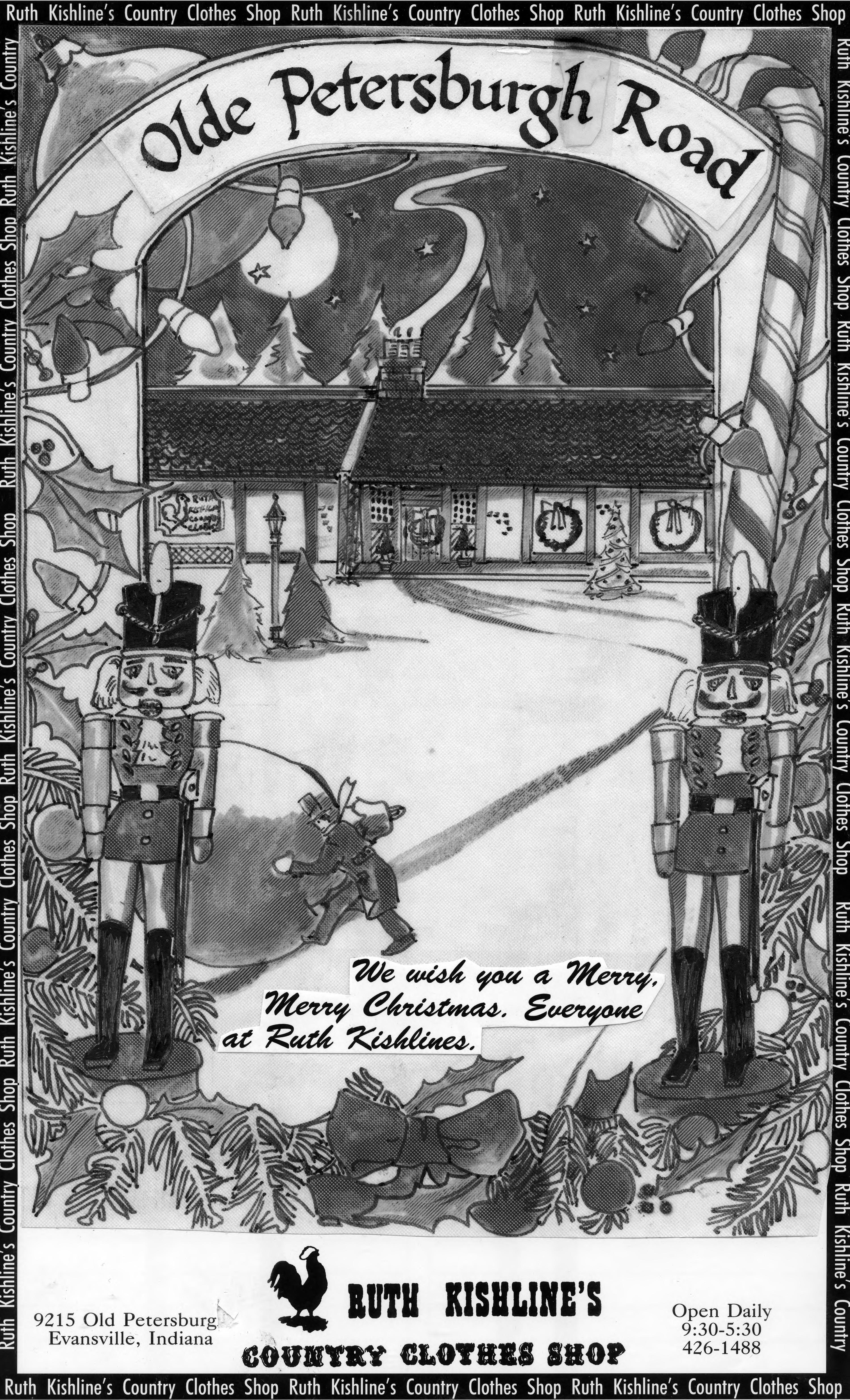 Sketch of a Christmas advertisement, with Olde Petersburg Road across the top and a depiction of the store below, and holly with 2 nutcrackers. This is the cut out of the advertisement, and the copy reads, We wish you a Merry, Merry Christmas, Everyone at Ruth Kishlines. The text also includes the name of the store, the address, and regular hours.