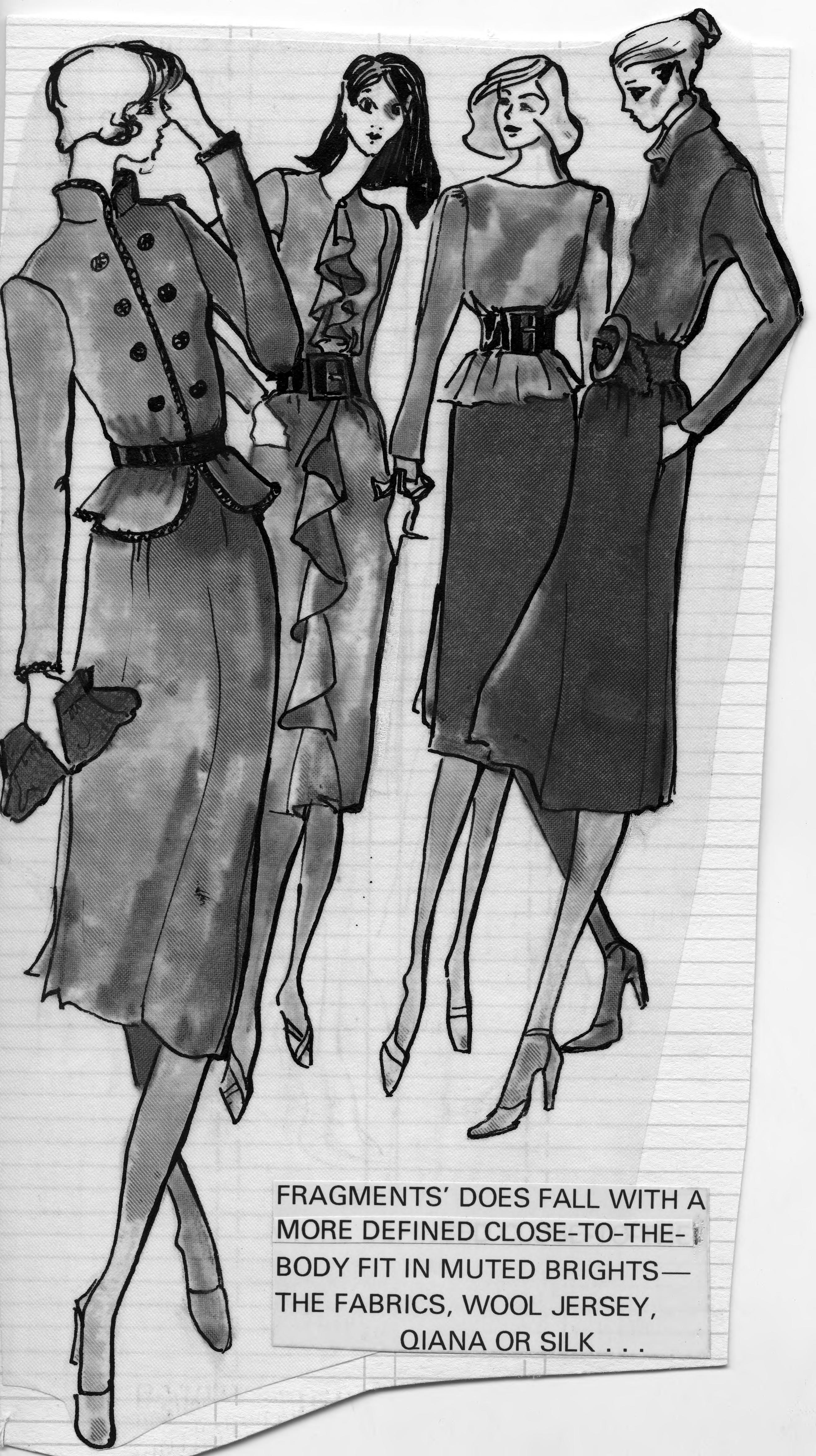 Sketch of a 4 women wearing dress or tops and skirts, all with long sleeves and all belted. The dress has a ruffle down the front. This is the cut out of the advertisement, and the copy reads, Fragments' does Fall with a more defined close-to-the-body fit in muted brights--the fabrics, wool jersey, qiana or silk...