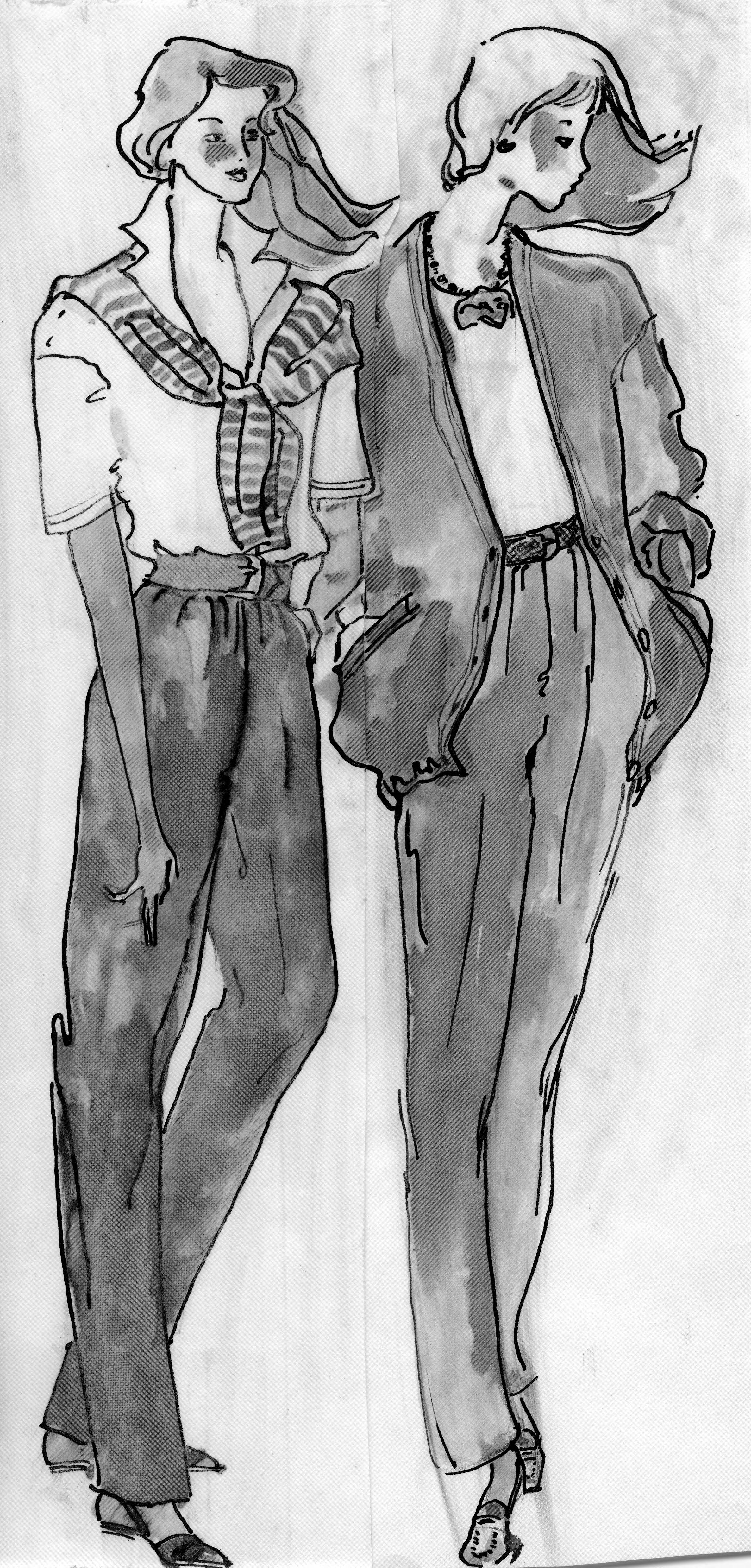 Sketch of 2 women wearing pants and a polo shirt with sweater across the shoulders, and with a cardigan. This is the cut out of the advertisement but there is no copy, nor is it mounted on board as are others in the collection. Attached to the picture are instructions for camera copy.