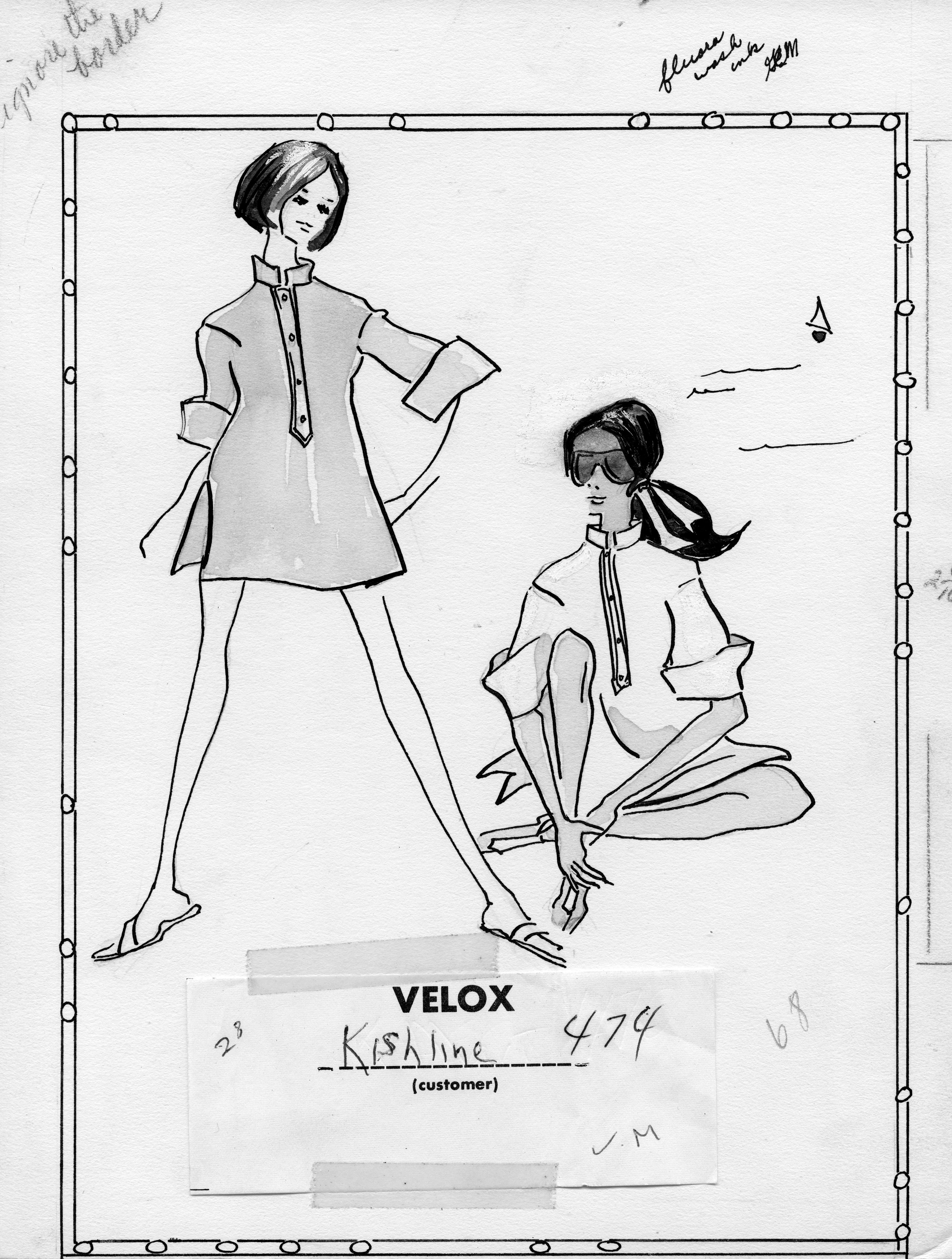 Sketch of two women in a vaguely nautical setting, wearing a shift, etc.--the text on the back, possibly the advertising copy, reads: You name it--it's an overshirt, it's a beach coat, it's a short shift--endless useful--at eight dollars.
