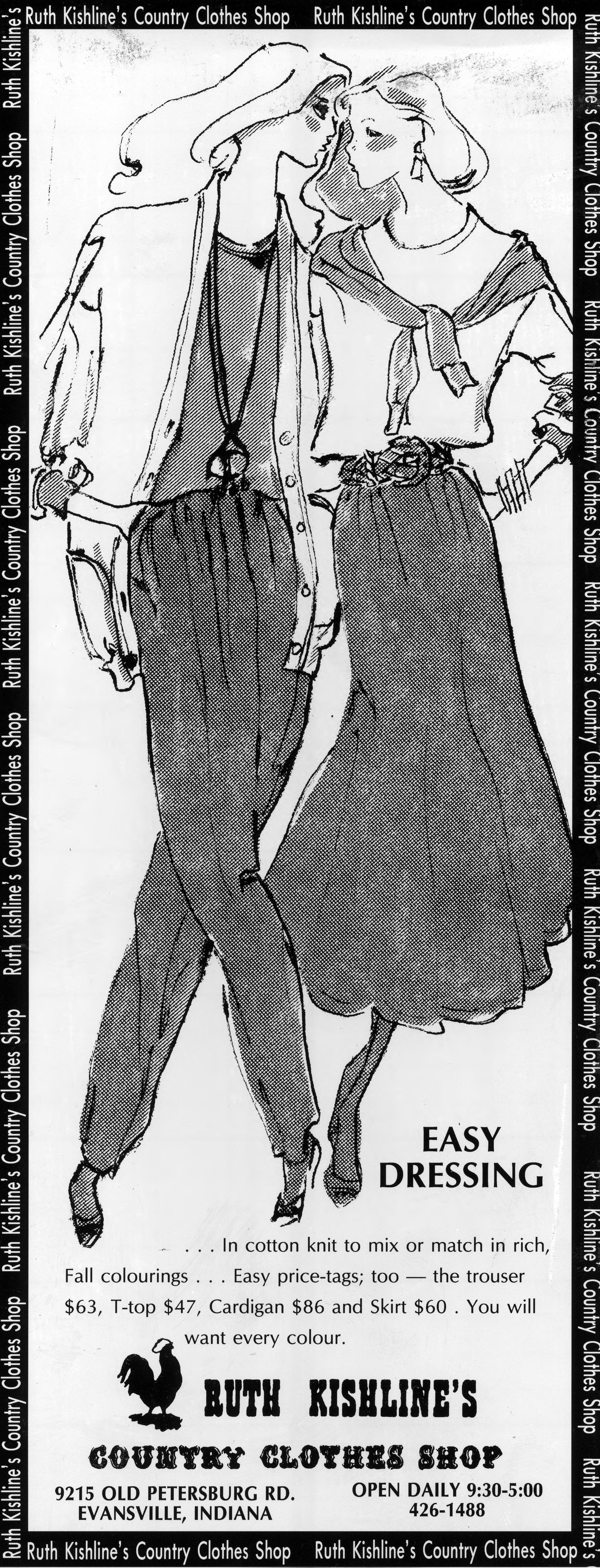 Sketch of 2 women wearing a cardigan over a t-shirt and pants, and a top with sweater tied around the shoulders with a skirt. This is the cut out of the advertisement, and the copy reads, Easy dressing....in cotton knit to mix or match in rich, Fall colourings...Easy price-tags; too--the trouser $63, T-top $47, Cardigan $86 and Skirt $60. You will want every colour. The text also includes the name of the store, the address, and regular hours. The date of September 24, 1989 is stamped on the back.