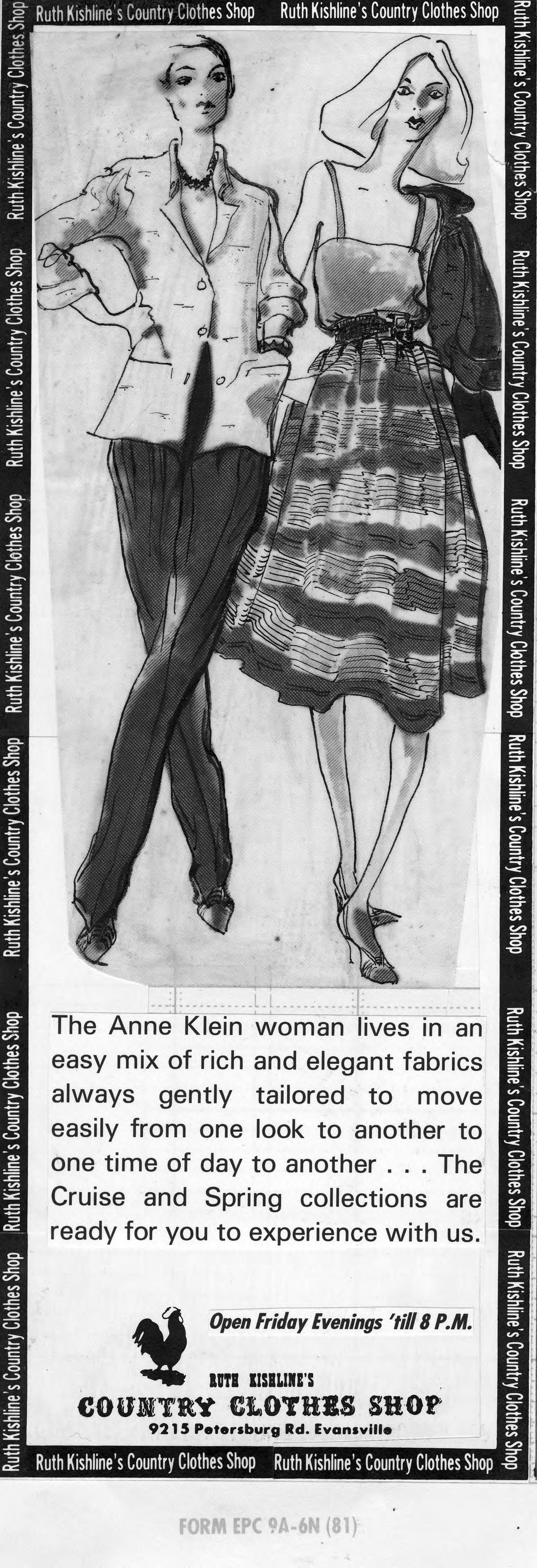 Sketch of 2 women wearing a jacket over pants and spaghetti-strap dress and belt. This is the cut out of the advertisement, and the copy reads, The Anne Klein woman lives in an easy mix of rich and elegant fabrics always gently tailored to move easily from one look to another to one time of day to another.The Cruise and Spring collections are ready for you to experience with us. The text also includes the name of the store, the address, and Friday hours. Anne Klein (August 3, 1923 - March 19, 1974) was an American fashion designer. Her birth name was Hannah Golofsky (it has also been written as Golofski). She changed her first name to Anne, and took Ben Klein's last name when she married him in 1948.. She was the first fashion designer after Coco Chanel to adapt men's clothing styles into how outfits were produced and designed for women.