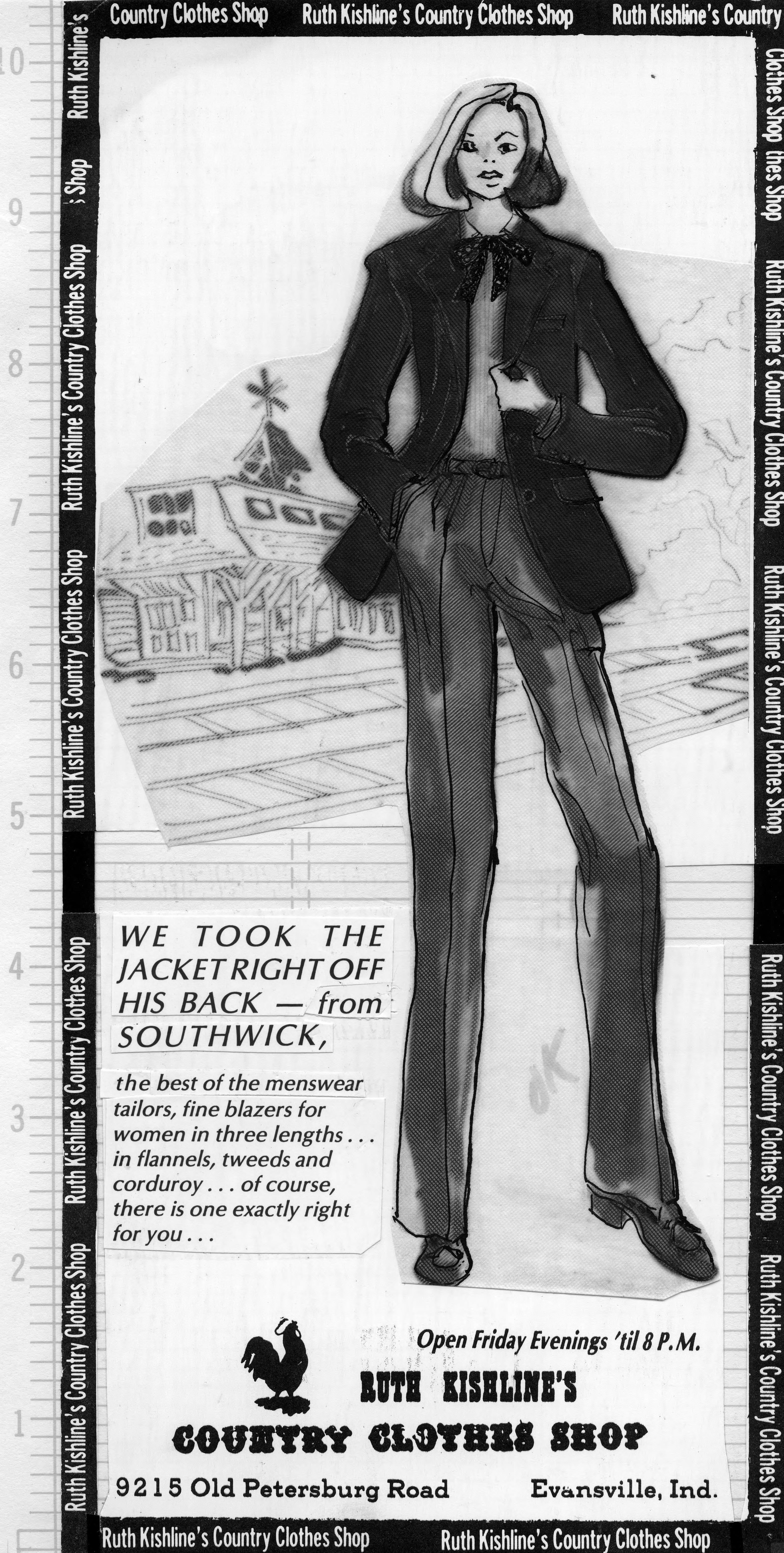 Sketch of a woman wearing a tailored jacket with pants, with a bow at the neck. This is the cut out of the advertisement, and the copy reads, We took the jacket right off his back--from Southwick, the best of the menswear tailors, fine blazers for women in three lengths...in flannels, tweeds and corduroy...of course, there is one exactly right for you.... The text also includes the name of the store, the address, and Friday hours. Since 1929, Southwick�s business philosophy has been firmly grounded in the singular vision of its founders � a love of quality and craftsmanship. Made in the USA, Southwick is synonymous with authentic American style, natural shoulder comfort, quality, and fine fabrics. Worn by presidents, ambassadors, corporate leaders and other men of distinction who chose Southwick to enhance their own style, not replace it. Southwick represents understated elegance and quality workmanship. (https://www.southwick.com/)