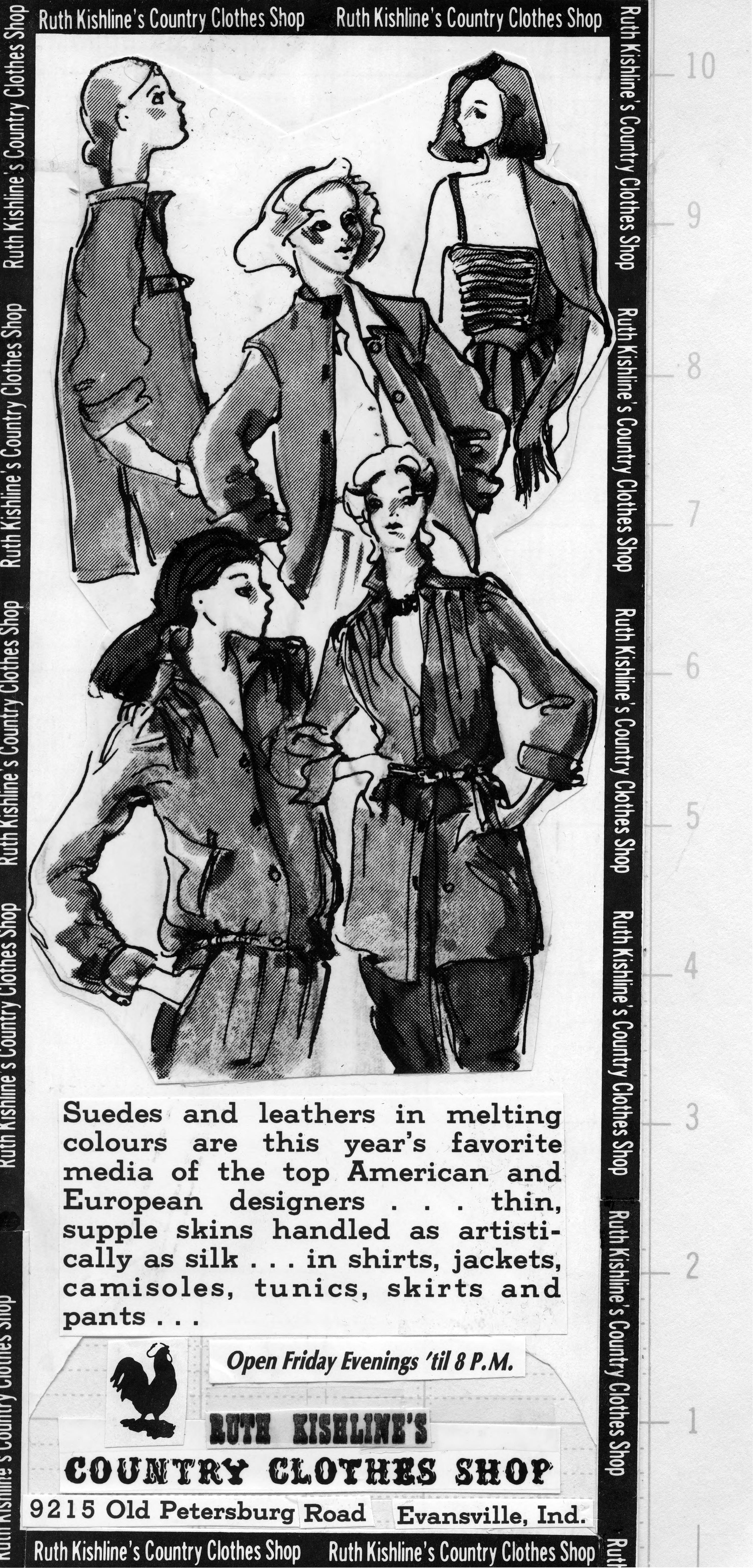 Sketch of 5 women wearing long-sleeved blouses. This is the cut out of the advertisement, and the copy reads, Suedes and leathers in melting colours are this year's favorite media of the top American and European designers....thin, supple skins handled as artistically as silk...in shirts, jackets, camisoles, tunics, skirts and pants.... The text also includes the name of the store, the address, and Friday hours.