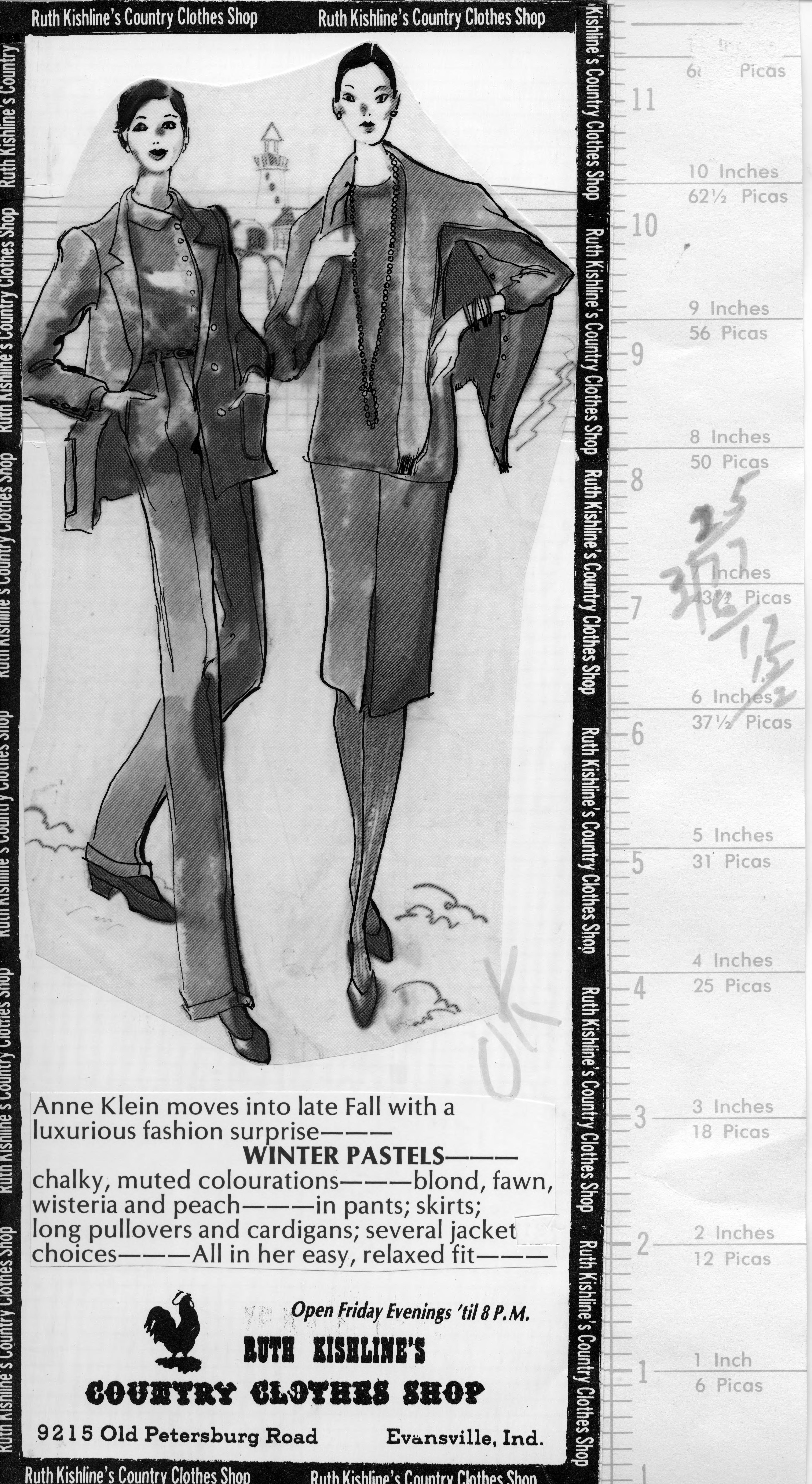 Sketch of 2 women wearing a pantsuit and a skirt and blouse with a sweater hung over the shoulders. This is the cut out of the advertisement, and the copy reads, Anne Klein moves into late Fall with luxurious fashion surprise--Winter pastels--chalky, muted colourations--blond, fawn, wisteria and peach--in pants; skirts; long pullovers and cardigans; several jacket choices--All in her easy, relaxed fit--- The text also includes the name of the store, the address, and Friday hours. Anne Klein (August 3, 1923 - March 19, 1974) was an American fashion designer. Her birth name was Hannah Golofsky (it has also been written as Golofski). She changed her first name to Anne, and took Ben Klein's last name when she married him in 1948.. She was the first fashion designer after Coco Chanel to adapt men's clothing styles into how outfits were produced and designed for women.