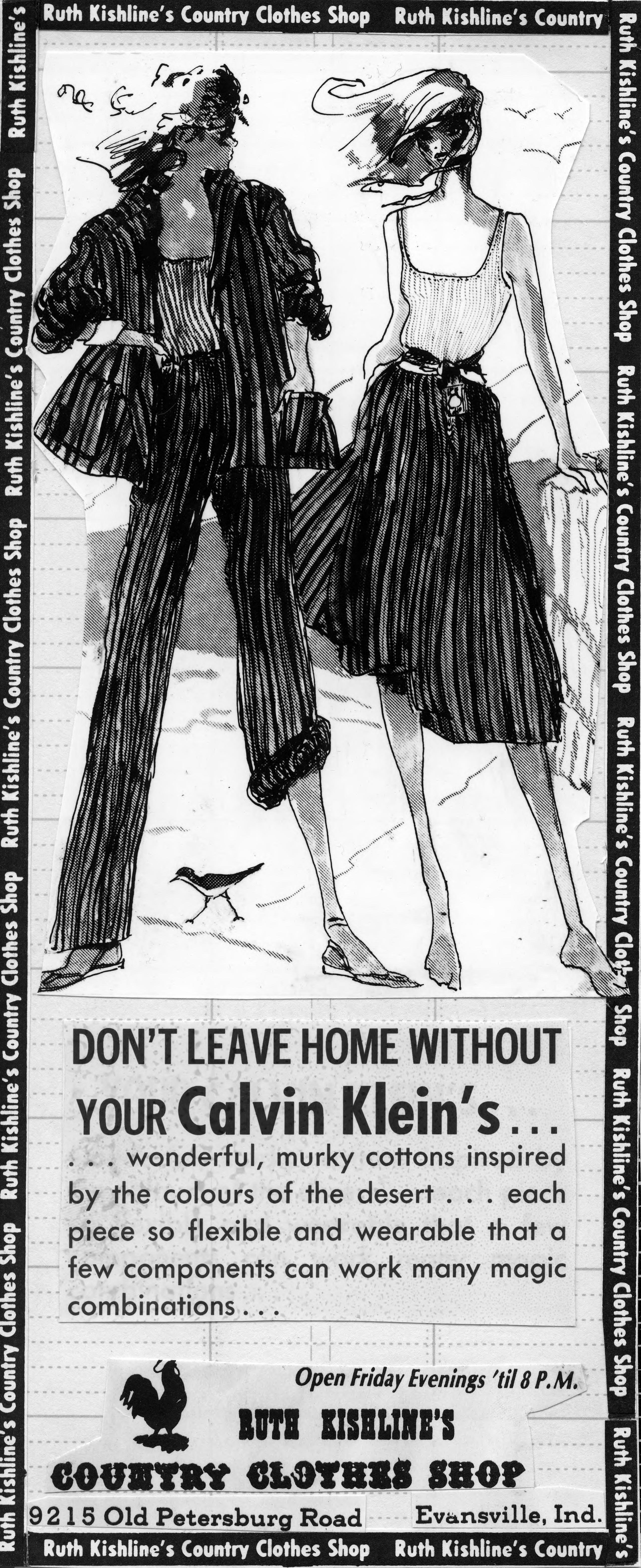 Sketch of 2 women wearing a loose jacket and pants, and a tank top and skirt (jacket, pants, and skirt are of the same fabric) in a nautical setting. This is the cut out of the advertisement, and the copy reads, Don't leave home without your Calvin Kleins....wonderful, murky cottons inspired by the colours of the desert....each piece so flexible and wearable that a few components can work many magic combinations.... The text also includes the name of the store, the address, and Friday hours. Calvin Klein is a global lifestyle brand that exemplifies bold, progressive ideals and a seductive, and often minimal, aesthetic. We seek to thrill and inspire our audience while using provocative imagery and striking designs to ignite the senses. After nearly 50 years, Calvin Klein continues to be a cultural catalyst across the globe by embracing tension, sparking ideas and creating unforeseen realities. We believe in a culture that provokes discovery and brave thinking. We strive to make a positive impact on the world. We inspire passion in our people. We embody authenticity and embrace individuality. Founded in 1968 by Calvin Klein and his business partner Barry Schwartz, we have built our reputation as a leader in American fashion through our clean aesthetic and innovative designs. Global retail sales of Calvin Klein products exceed $8 billion in 2015 and were distributed in [over] 110 countries. Calvin Klein employs over 10,000 associates globally. In 2003, we were acquired by PVH Corp., one of the largest apparel companies in the world. With a history going back over 130 years, PVH has excelled at growing brands and businesses with rich American heritages, becoming one of the largest global apparel companies. We have over 30,000 associates operating in over 40 countries with over $8 billion in revenues. We own the iconic Calvin Klein, Tommy Hilfiger, Van Heusen, IZOD, ARROW, Speedo*, Warner�s and Olga brands and market a variety of goods under these and other nationally and internationally known owned and licensed brands. (https://explore.calvinklein.com/en_US/corporate)