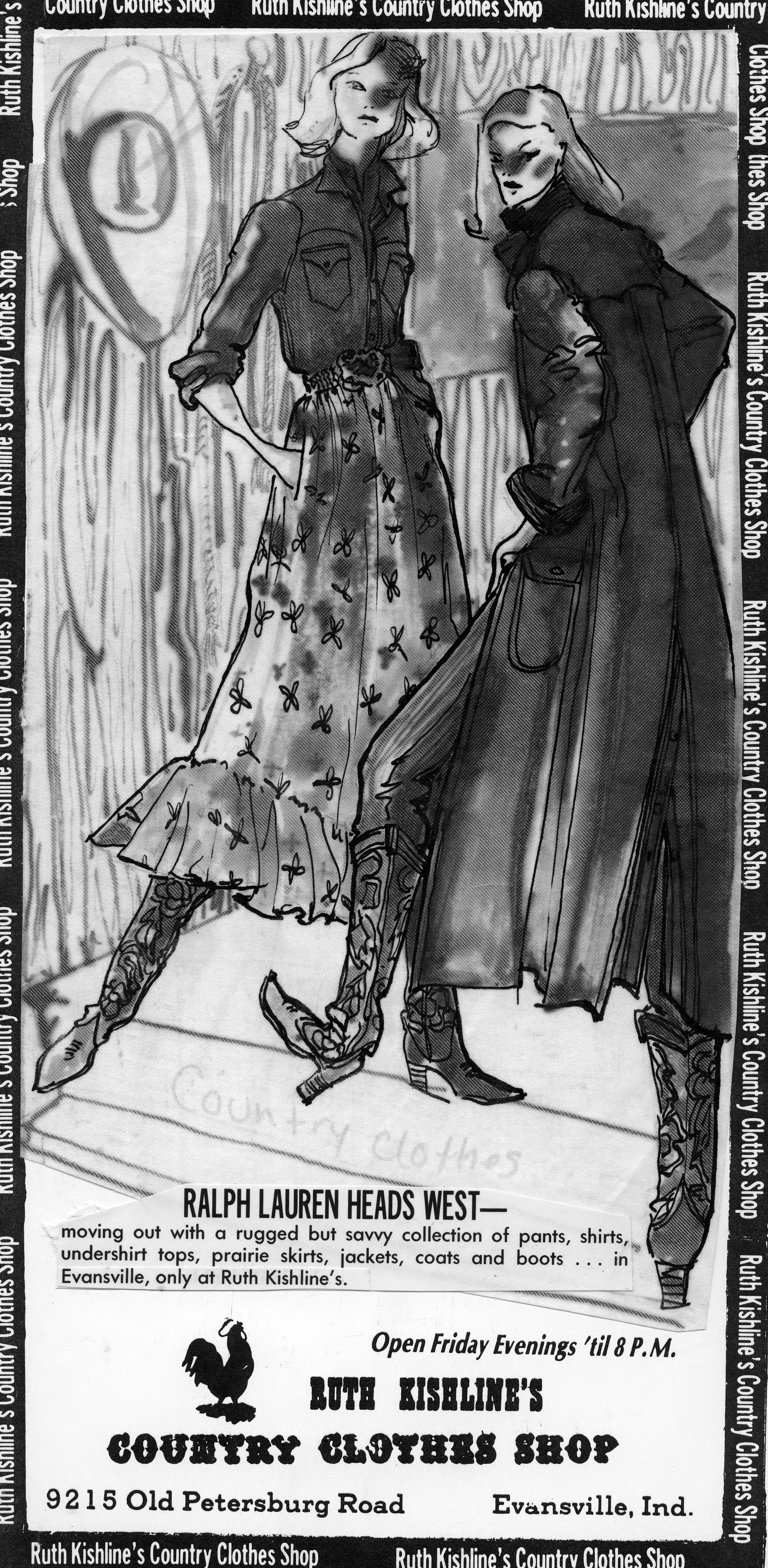Sketch of 2 women wearing Western inspired clothing--a blouse with skirt with ruffle at the hem and cowboy boots and a trench coat with cowboy boots. This is the cut out of the advertisement, and the copy reads, Ralph Lauren heads West--moving out with a rugged but savvy collection of pants, shirts, undershirt tops, prairie skirts, jackets, coats and boots.in Evansville, only at Ruth Kishline's. The text also includes the name of the store, the address, and Friday hours. Ralph Lauren (born Ralph Lifshitz; October 14, 1939) is an American fashion designer, philanthropist, and business executive, best known for the Ralph Lauren Corporation, a global multibillion-dollar enterprise. .From 1962 to 1964 he served in the United States Army and left to work briefly for Brooks Brothers as a sales assistant before becoming a salesman for a tie company. The Ralph Lauren Corporation started in 1967 with men's ties. At 28 years old, Lauren worked for the tie manufacturer Beau Brummell, where he convinced the company's president to let him start his own line. Drawing on his interests in sports, Ralph Lauren named his first full line of menswear �Polo' in 1968. He worked out of a single drawer from a showroom in the Empire State Building and made deliveries to stores himself. By 1969, the Manhattan department store Bloomingdale's sold Lauren's men line exclusively. It was the first time that Bloomingdale's had given a designer their own in-store boutique. In 1971, Ralph Lauren Corporation launched a line of tailored shirts for women, which introduced the Polo player emblem to the world for the first time, appearing on the shirt's cuff. The first full women's collection was launched the following year. 1971 also marked the opening of Ralph Lauren's store on Rodeo Drive in Beverly Hills, California. This is the first freestanding store for an American designer. In 1972 the Ralph Lauren Corporation introduced a signature cotton mesh Polo shirt in various colors. Featuring the polo player logo at the chest, the shirt became emblematic of the preppy look--one of Ralph Lauren's signature styles. The tagline for the ad campaign was: Every team has its color � Polo has seventeen.