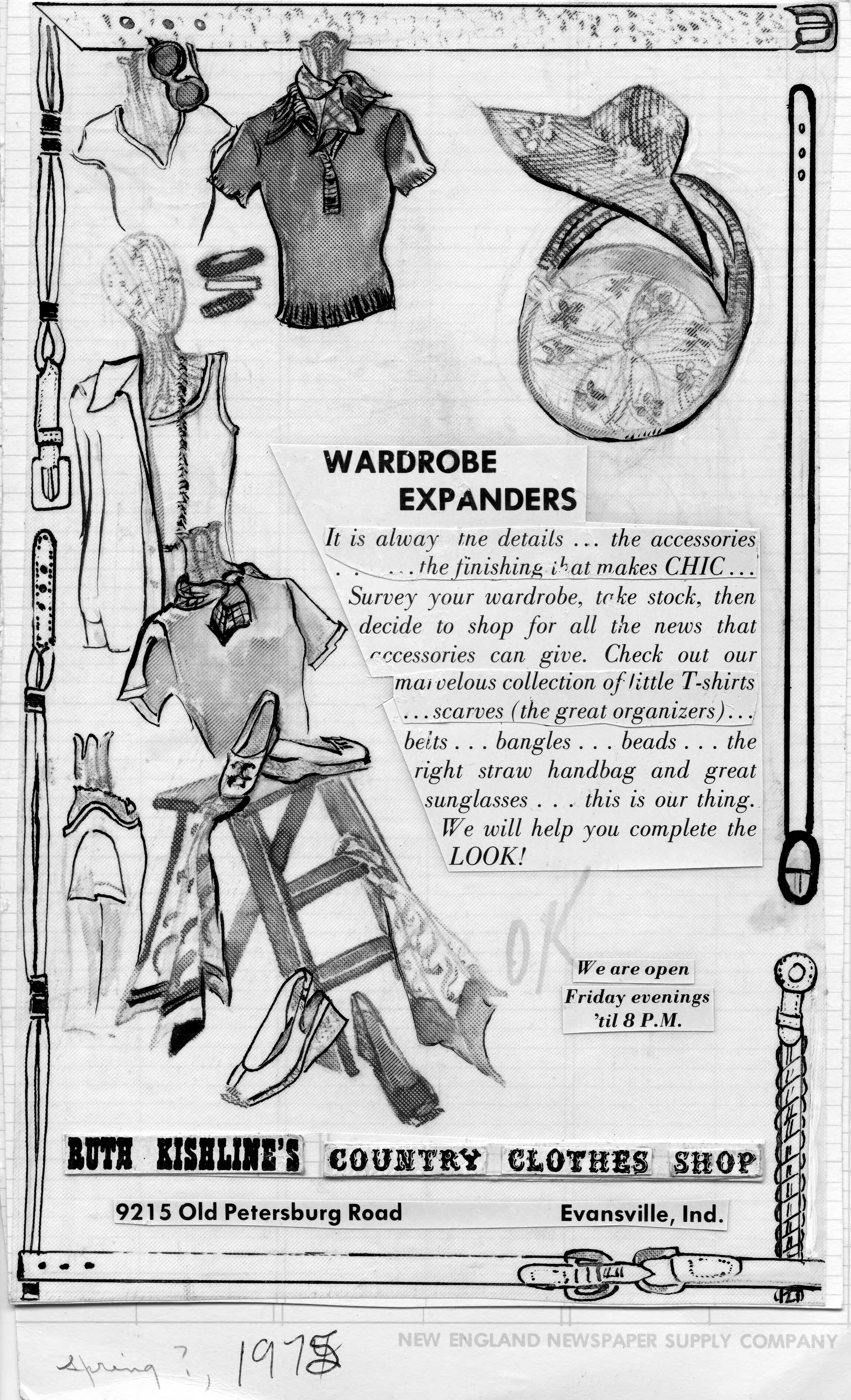 Sketch of a sunhat, blouse, shoes, and t-shirts. This is the cut-out of the advertisement, and the copy reads, Wardrobe Expanders It is always the details�the finishing that makes CHIC�Survey your wardrobe, take stock, then decide to shop for all the news that accessories can give. Check out our marvelous collection of little T- shirts....scarves (the great organizers)....belts...bangles...beads...the right straw handbag and great sunglasses...this is our thing. We will help you complete the look! Text also includes the fact that the store, Ruth Kishline's Country Clothes Shop at 9215 Old Petersburg Road in Evansville, Ind. was open until 8 Friday evenings.