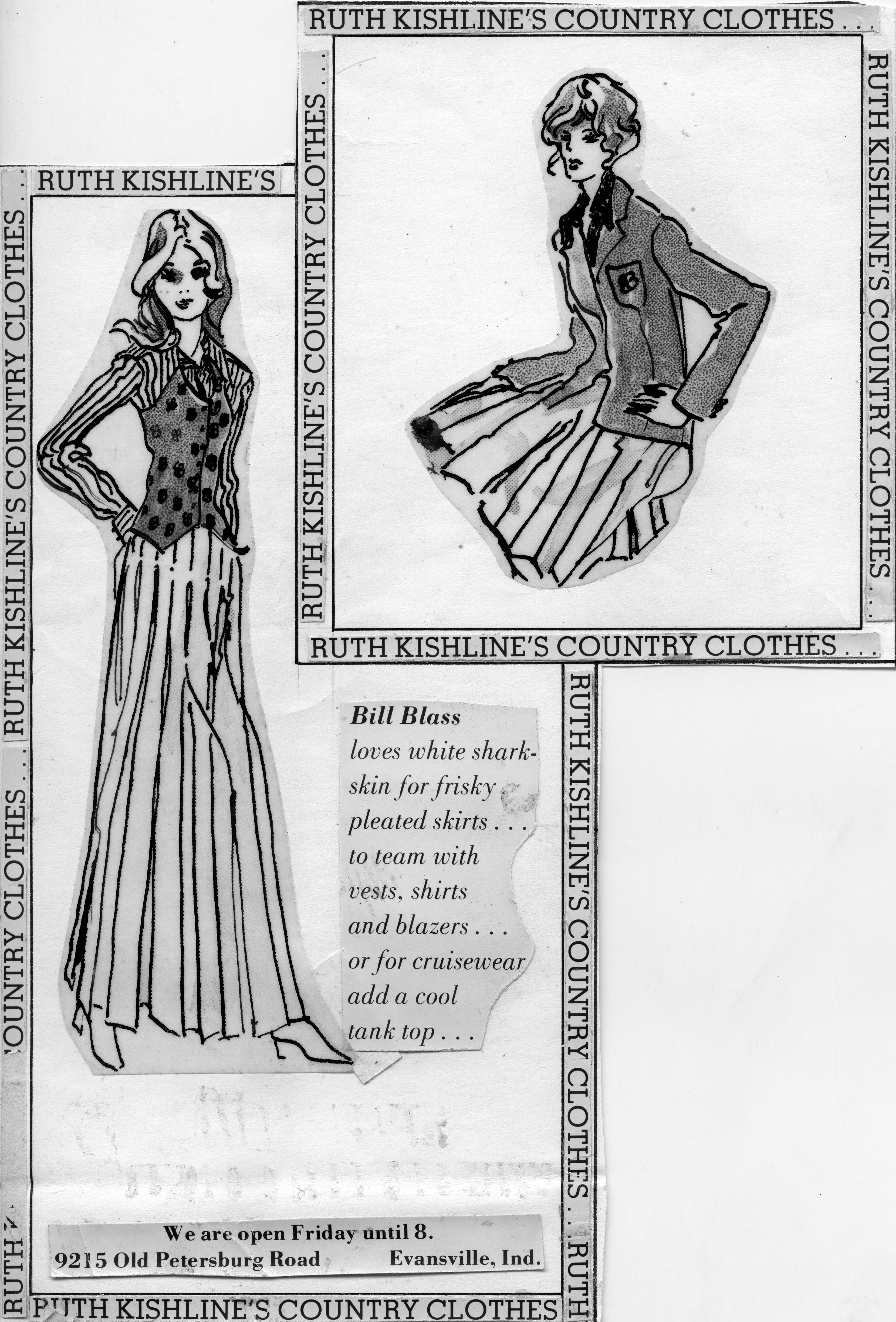 Sketch of a 2 women wearing pleated skirts--one below the knee length, team with a blazer, the other ankle length, teamed with a blouse and weskit. This is a cut-out of the advertisement, and the copy reads, Bill Blass loves white sharkskin for frisky pleated skirts.to team with vests, shirts and blazers, or for cruise wear add a cool tank top. The ad also includes this: Ruth Kishline's Country Clothes We are open Friday until 8. 9215 Old Petersburg Rd. Evansville, Ind. William Ralph Bill Blass (June 22, 1922 � June 12, 2002) was an American fashion designer, born in Fort Wayne, Indiana. He was the recipient of many fashion awards, including seven Coty Awards and the Fashion Institute of Technology's Lifetime Achievement Award (1999). . Blass began his New York fashion career in 1945. He was a prot�g� of Baron de Gunzburg. In 1970, after two decades of success in menswear and womenswear, he bought Maurice Rentner Ltd., which he had joined in 1959, and renamed it Bill Blass Limited. Over the next 30 years he expanded his line to include swimwear, furs, luggage, perfume, and chocolate. By 1998, his company had grown to a $700-million-a-year business. Beginning in 1976, and continuing until 1992, Blass lent his talents to the Ford Motor Company for an edition of their Continental Mark series of automobiles. In 1976, he shared model configurations with Emilio Pucci, Hubert de Givenchy, and Cartier. Each year, as goes true fashion, the interior and exterior color combinations would be updated.