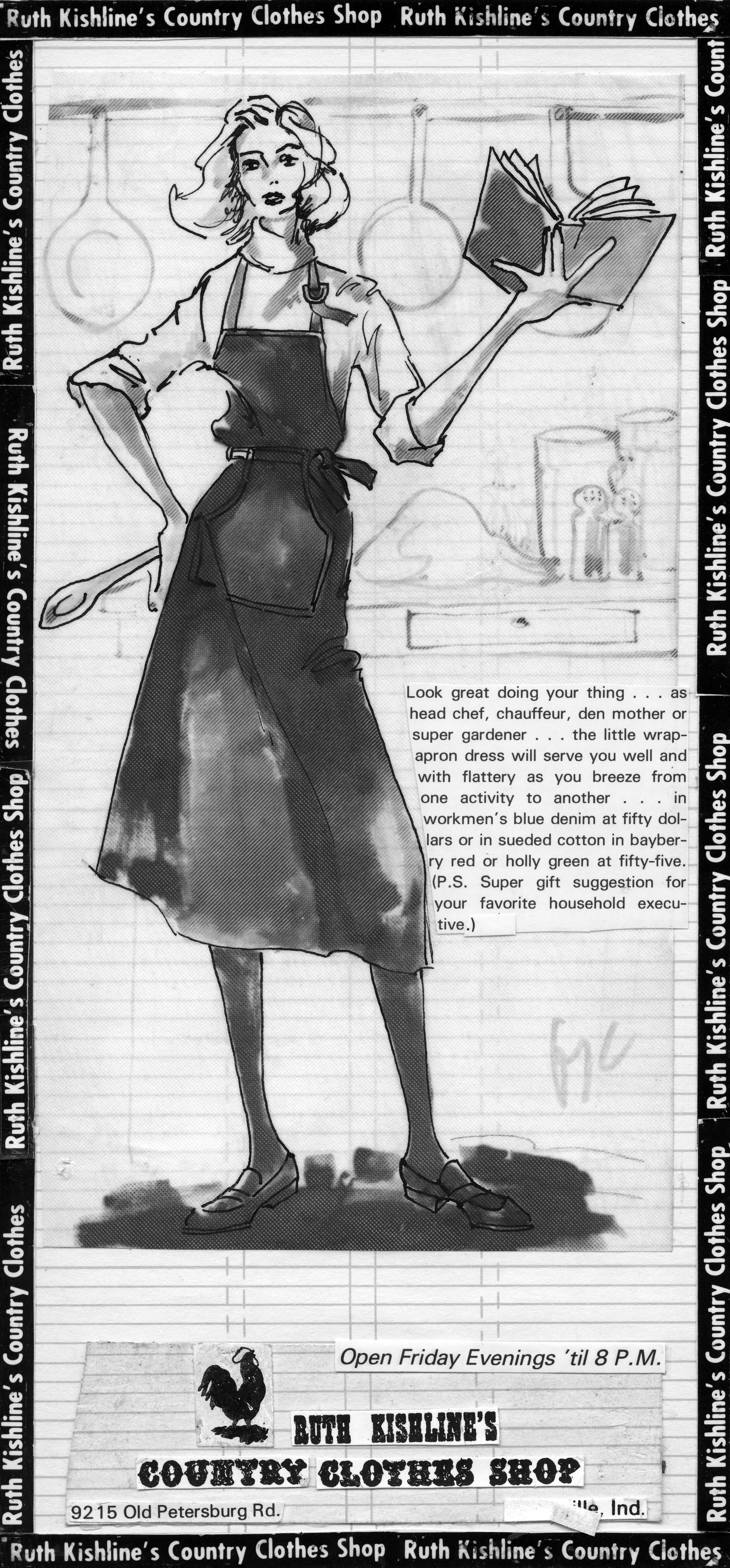 Sketch of a women wearing a jumper and turtleneck, posed in a kitchen setting and holding a spoon and cookbook. This is the cut out of the advertisement, and the copy reads, Look great doing your thing...as head chef, chauffeur, den mother or super gardener...the little wrap-apron dress will serve you well and with flattery as you breeze from one activity to another...in workmen's blue denim at fifth dollars or in sueded cotton in bayberry red or holly green at fifty-five. (P.S. Super gift suggestion for your favorite household executive.) The text also includes the name of the store, address, and Friday hours.