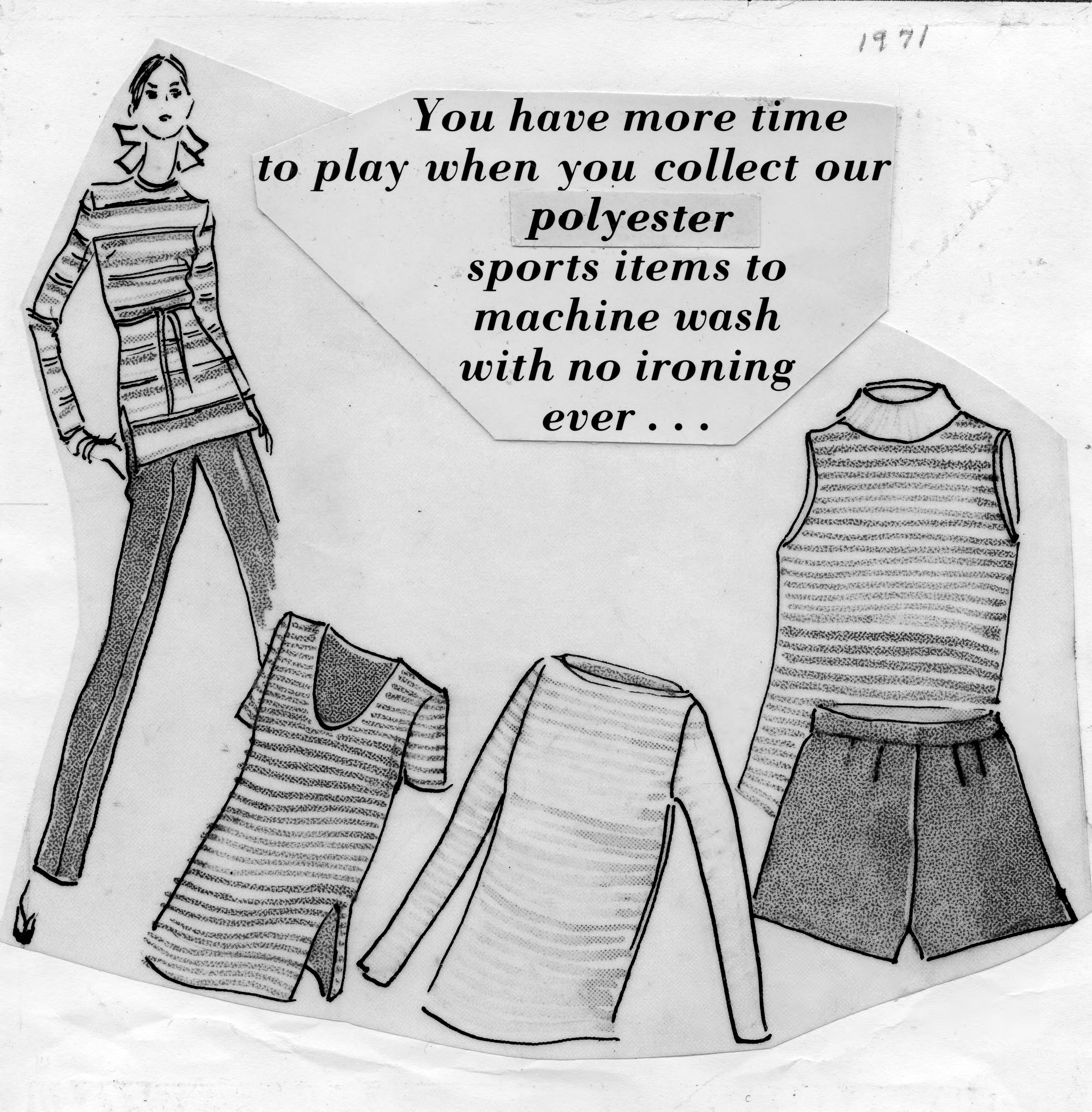 Sketch of a woman wearing pants and a tunic-length, self tie belted, long-sleeved top. To coordinate with this are a short-sleeved V-neck top with slits at the hem, a long-sleeved top with a boat neckline, a sleeveless mock turtleneck top, and a pair of shorts. This is the cut-out of the advertisement and the copy reads, You have more time to play when you collect our polyester sports items to machine wash with no ironing ever...