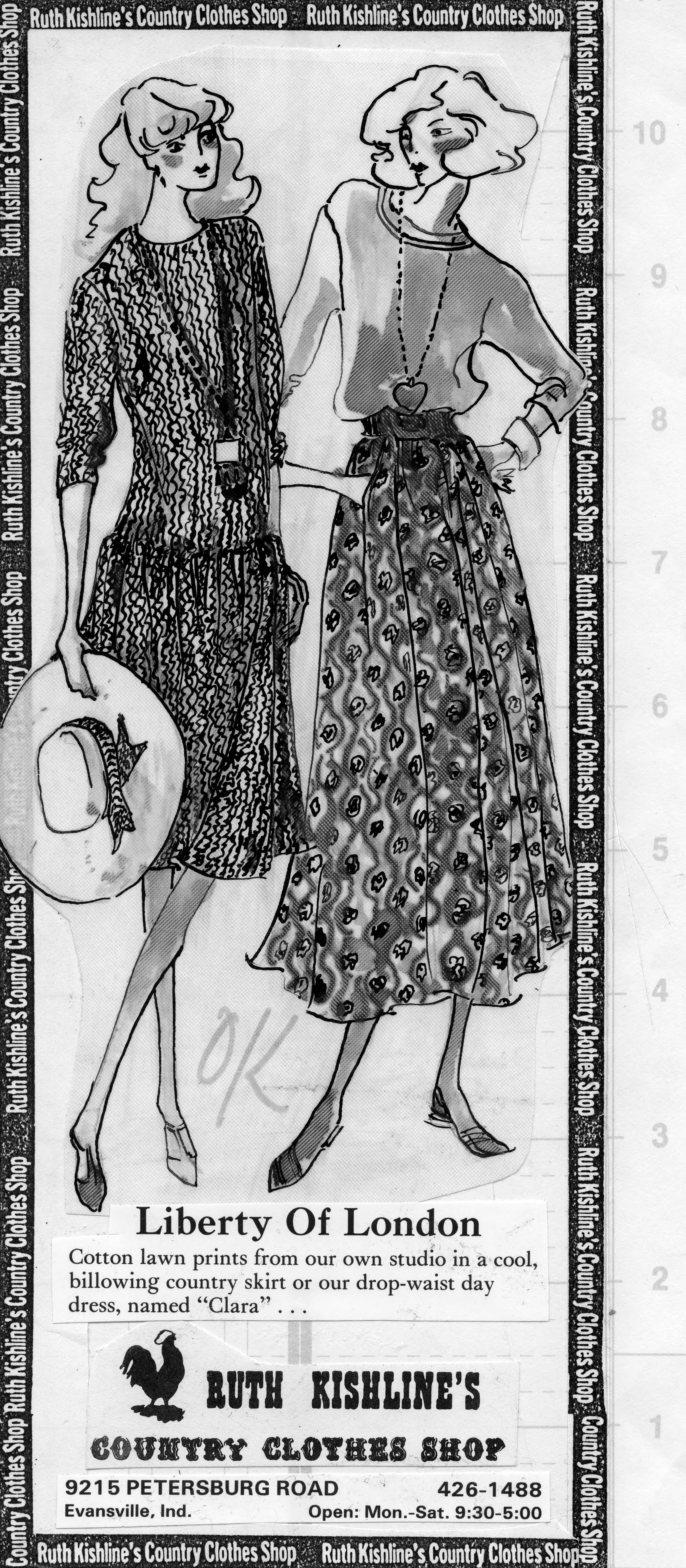 Sketch of 2 women wearing a dropped waist dress and a blouse with skirt. This is the cut out of the advertisement, and the copy reads, Liberty of London. Cotton lawn prints from our own studio in a cool, billowing country skirt or our drop waist day cress, named Clara ... The text also includes the name of the store, the address, and regular hours. The date of April 30, 1989 is stamped on the back. �When our adventurous founder Arthur Lasenby Liberty laid plans for a London emporium laden with luxuries and fabrics from distant lands, his dream was to metaphorically dock a ship in the city streets. To this day, a voyage of discovery awaits on the good ship Liberty, with history hidden amongst six floors of cutting-edge design, unexpected edits and beautiful wares from the world's greatest craftspeople. In 1875, Arthur borrowed �2,000 from his future father-in-law and took a building on Regent Street, London with just three dedicated staff and plenty of ambition. Liberty's collection of ornaments, fabric and objets d'art from around the world proved irresistible to a society intoxicated at the time by Japan and the East and Liberty effected social change in interior design and dress, so much so that the Art Nouveau period in Italy is called 'Liberty Style'. Within eighteen months the loan was repaid. A realisation of Arthur's original vision, our magnificent Great Marlborough Street shop followed in 1924. Our beautiful building was designed by Edwin T. Hall and his son Edwin S. Hall. In 1922, the builders Messrs Higgs & Hill were given a lump sum of �198,000 to construct it, which they did from the timbers of two ancient 'three-decker' battle ships. Records show more than 24,000 cubic feet of ships timbers were used including their decks now being the shop flooring: The HMS Impregnable - built from 3040 100-year-old oaks from the New Forest - and the HMS Hindustan, which measured the length and height of our Liberty building. The 1920s was a time of Tudor revival, considered the most crafted and English of architecture, so the shop was engineered around three atriums. Designed to feel like a home, each atrium was surrounded by smaller rooms, complete with fireplaces and furnishings. Ever the purveyor of craftsmanship, Arthur Liberty had a furniture workshop in Archway, London. Run by Lawrence Turner, the workshop produced Liberty Arts and Crafts furniture and the intricately carved panels and pillars found throughout the store. The craftsmen allowed his fantasy, ensuring every ornament was a one-off - paving the way for discovery. Sadly, Arthur died seven years before the building's completion and so never saw his dream realised. But, his statue stands proudly at our Flower Shop entrance to welcome you warmly into his emporium of wonder. The building is now a heritage listed London icon and today, Liberty is famed for its directional design, cultural collaborations and inspiring curation. Our dedicated in-house design studio is still at the core of all that we do, hand painting and creating our beautiful prints, and reworking finds from the 45,000-strong archive.� (https://www.libertylondon.com/uk/information/the-store/store-heritage.html)