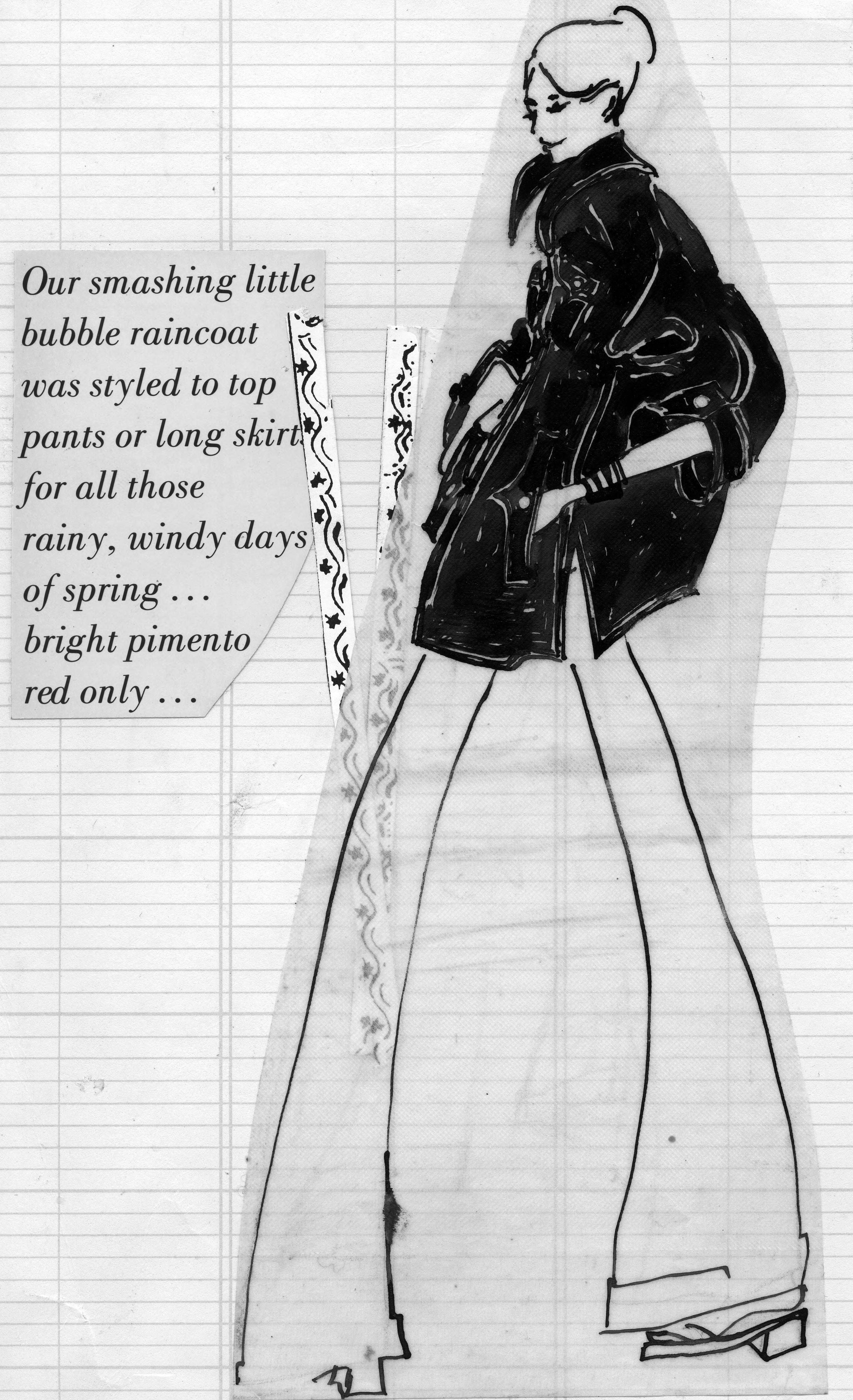 Sketch of a woman wearing a hip length raincoat, ful, with slits at the hem, over pants. This is the cut-out of an advertisement, and the copy reads, Our smashing little bubble raincoat was styled to top pants or long skirts for all those rainy, windy days of spring...bright pimento red only....