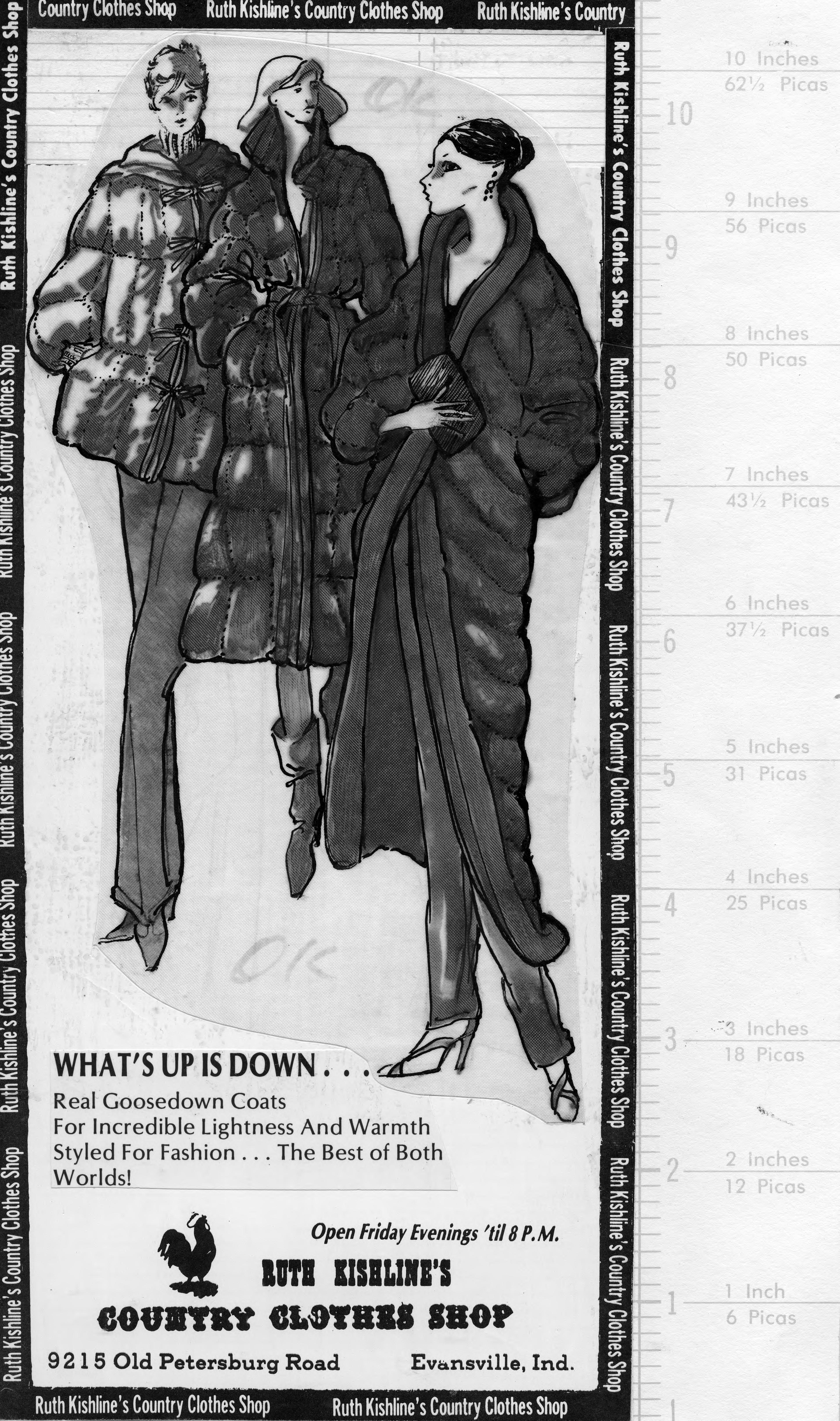 Sketch of 3 women wearing down jacket and coats, one coat ankle length. This is the cut out of the advertisement, and the copy reads, What's Up is Down�Real goosedown coats for incredible lightness and warmth styled for fashion...the best of both worlds! The text also includes the name of the store, the address, and Friday hours.