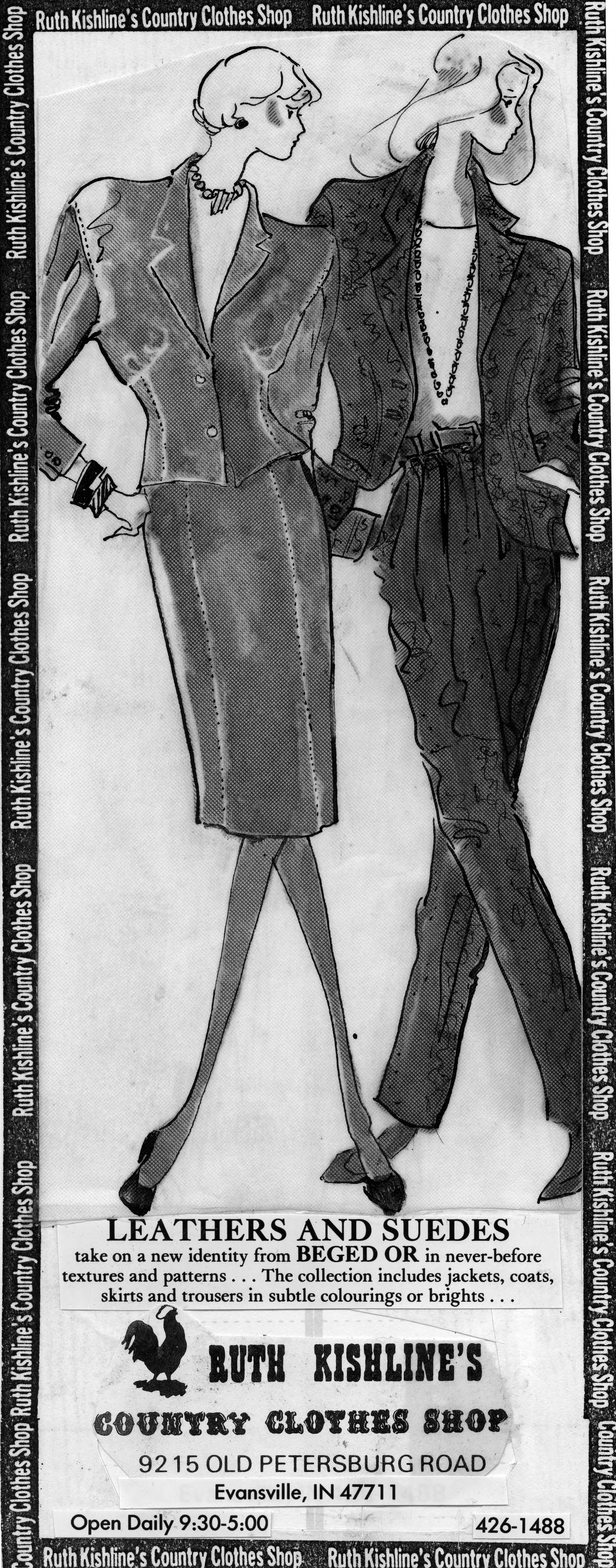 Sketch of two women wearing broad-shouldered jackets with skirt or pants. This is the cut out of the advertisement, and the copy reads, Leathers and sudeds take on a new identity from Beged Or in never before textures and patterns...The collection includes jackets, coats, skirts and trousers in subtle colourings or brights... The text also includes the name of the store, the address, and regular hours. The date of September 11, 1988 is stamped on the back.