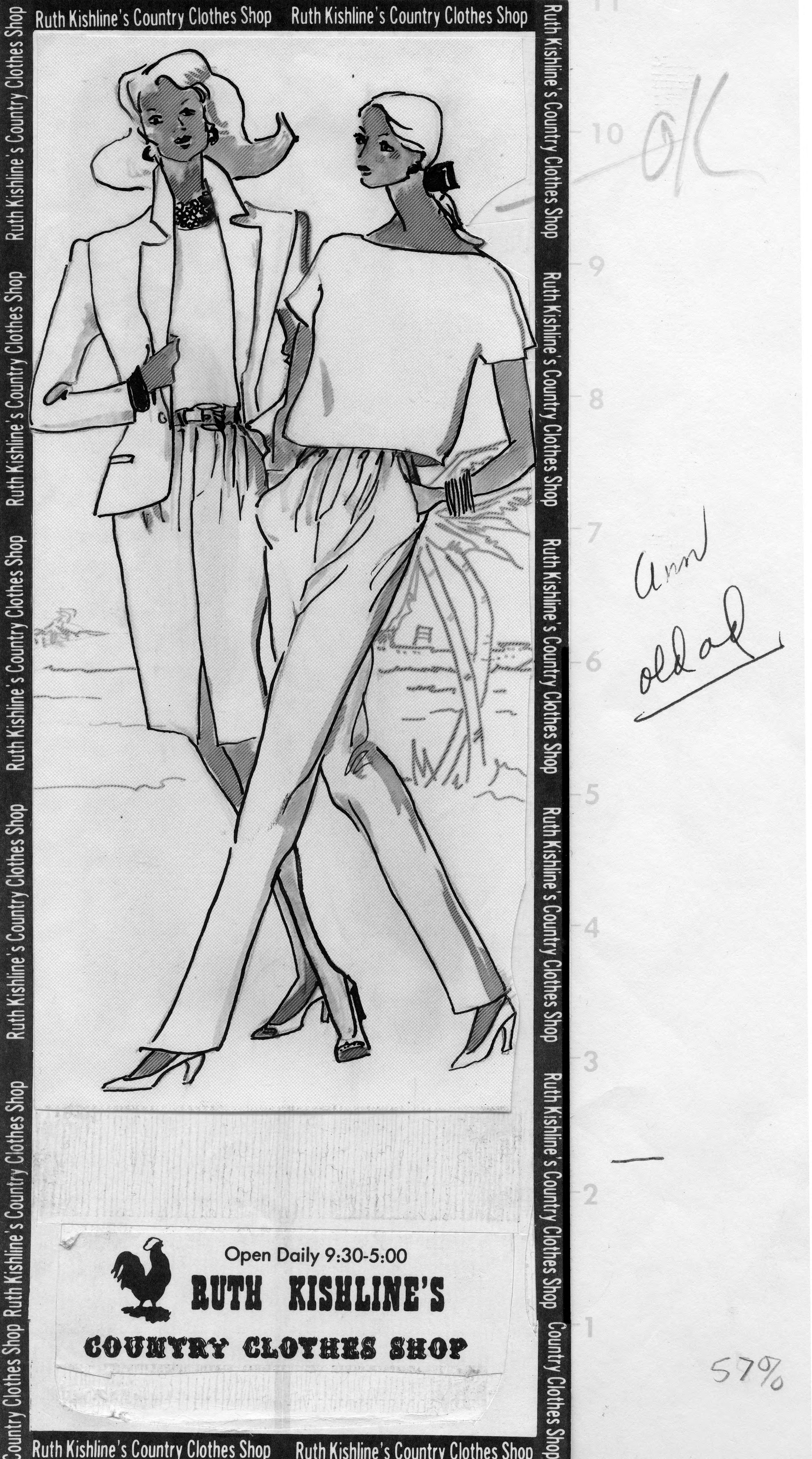 Sketch of 2 women wearing a light colored business jacket with skirt and loose blouse with pants. This is the cut out of the advertisement, but no copy is present. The text includes the name of the store, the address, and regular hours. Handwritten is old ad and 57%. The date of January 25, 1988 is stamped on the back.
