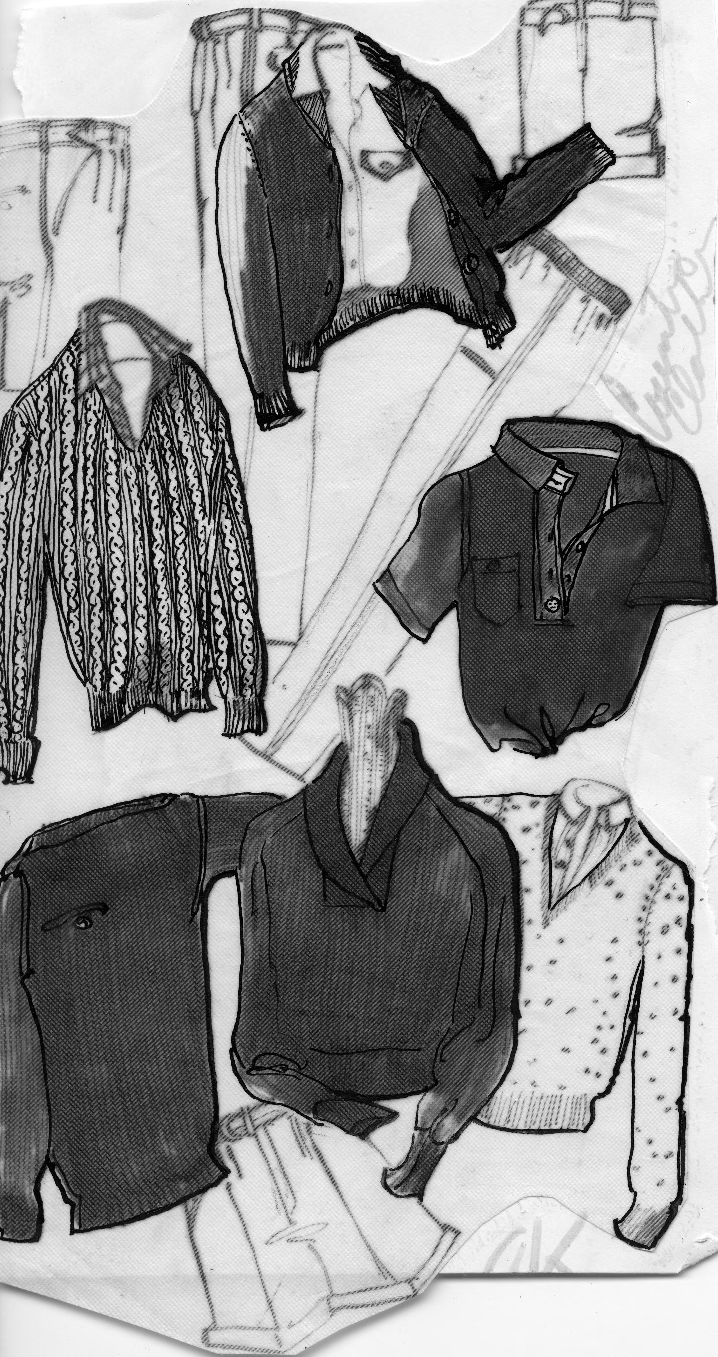 Sketch of a jacket, sweaters, and a polo shirt, with pants and shorts in the background. Handwritten are the words Country Clothes.