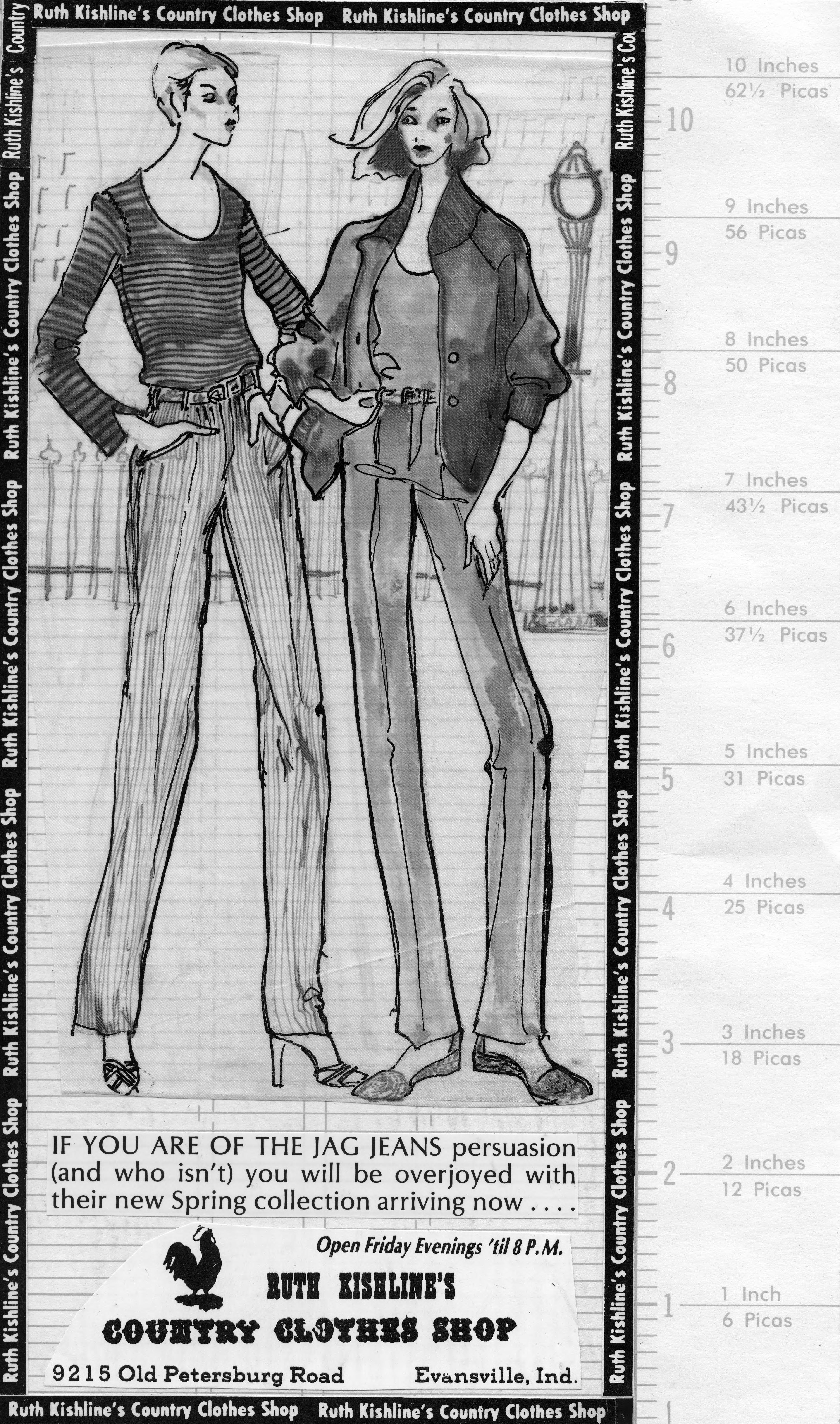 Sketch of 2 women wearing a long-sleeved top and a jacket, both with pants. This is the cut out of the advertisement, and the copy reads, If you are of the JAG jeans persuasion (and who isn't) you will be overjoyed with their new Spring collection arriving now.... The text also includes the name of the store, the address, and Friday hours.