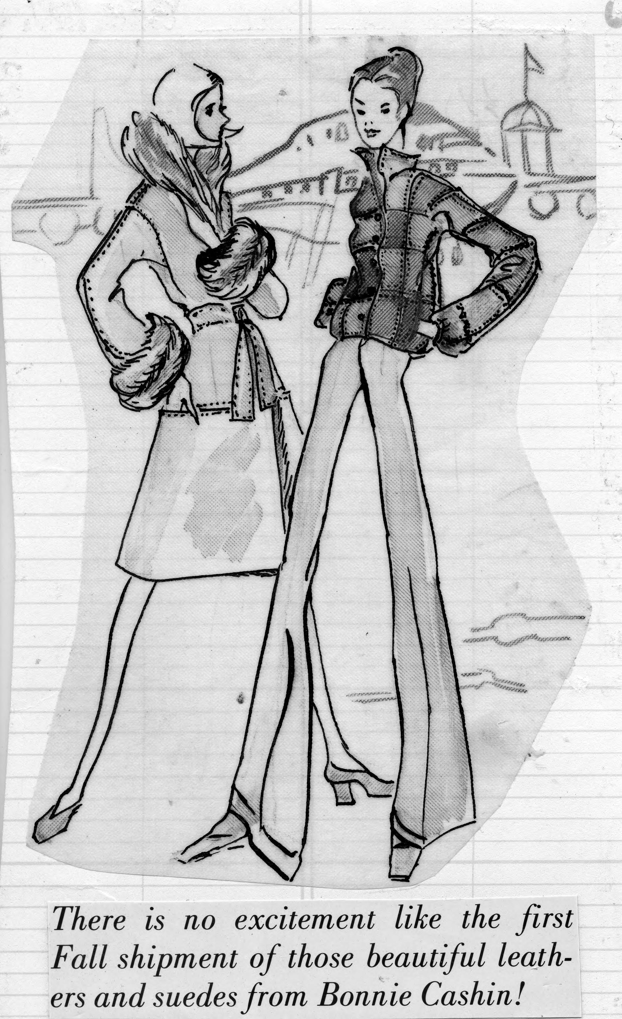 Sketch of 2 women in a travel motif, with a drawing of a plane behind them. One wears a knee-length coat with fur around the collar and cuffs, tie-closure. The other wears wide legged cuffed pants and a hip length checkered jacket. This is the cut-out of the advertisement, and the copy reads, There is no excitement like the first Fall shipment of those beautiful leathers and suedes from Bonnie Cashin! Bonnie Cashin (September 28, ca. 1908� February 3, 2000) was an American designer and is considered one of the pioneering designers of American sportswear. She created practical, uncomplicated clothing that catered to the independent woman of the post-war era. . Cashin is often cited creating both the concept of layering clothing and for coining the term. The idea of layering came from time she spent in Asia. Her use of leather, mohair and hardware was pioneering and the brass turnlocks that kept the top of her 1940s convertible down became a signature feature of Coach handbags.